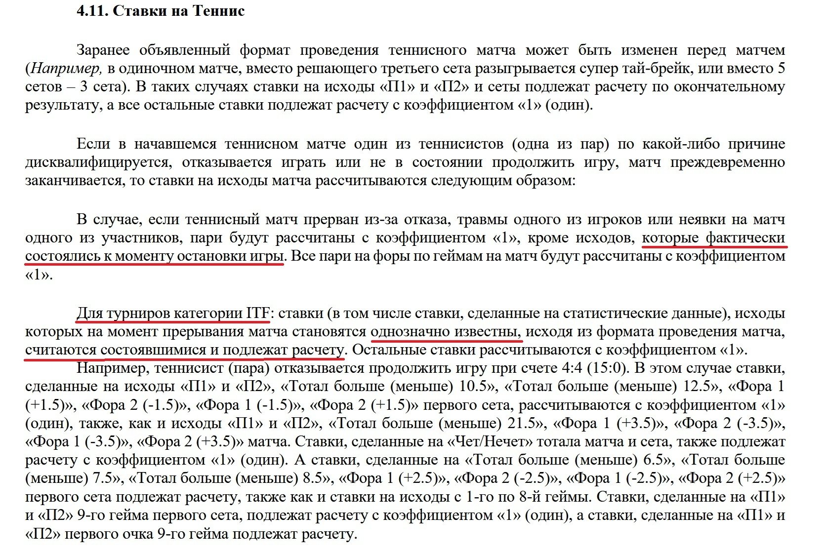 Пари номер 1887308927. Экспресс на теннис. Де Минор - тиафо, победа Де минора и фора +3.5 гейма на матч Рублев-Фокина на Рублева. Вопрос по расчету форы +3.5 по геймам на Рублева с коэф.1.Согласно п правил бк Бетбум к моменту снятия игрока Фокина, результат ставки на фору +3.5 на Рублева уже однозначно известен. Счёт при снятии 6-7 7-6 3-0 в пользу Рублева. Почему ставку в экспрессе рассчитали возвратом?