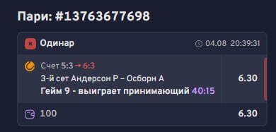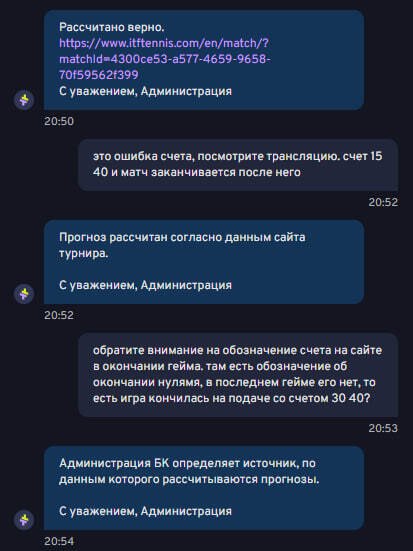 Мной была сделана ставка на победу принимающей со счетом 15-40 в последнем гейме матча. Так и произошло, но в лайве кто-то засчитал поинт подающей и матч технически, даже на сайте, завершился со счетом 30-40 на подаче. В трансляции четко видно что матч закончился после розыгрыша на счете 15-40. Тех. поддержка отказалась рассматривать запрос на просмотр трансляции и не стала даже обращать внимание что все геймы на сайте завершенные отображаются нулями://