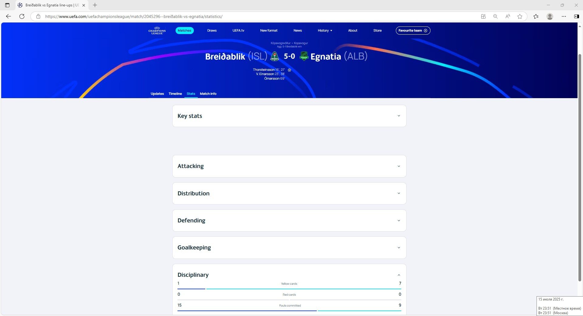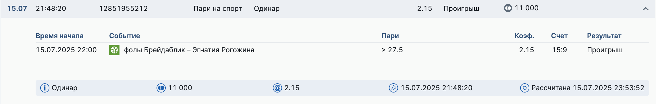 Здравствуйте. Стояла ставка на кэф 2,15 на >27,5 фолов в матче Брейдаблик против Эгнатии(5:0) суммой 11000 рублей = 23650 рублей. В лайве по статистике фонбета на 85 минуте было 26 фалов, в этот момент они отрубают эту статистику и возможность поставить, после этого в матче было еще больше 5-6 фолов. Производят расчет - в матче 24 фола, написал запрос, прислали скрин с сайта УЕФА, где действительно 24 фола. Но я матч смотрел, и там было намного больше. Написал в УЕФА об этой ошибке, спустя две недели они статистику поменяли, у меня есть скриншоты и ссылка, это легко найти. Они поменяли на 36 фолов. Написал об этом в Фонбет, они уповают на правило 4.4. Но 1) Статистика в лайве отображалась выходит неверно, так как итогово у них получилось 24 фола, а в лайве уже было 26, хотя матч еще не закончился и было больше.Просил уточнить эту информацию у аналитиков но был проигнорирован. 2) В чем в данном случае я проиграл? Ведь получается моя ставка сыграла и фолов аж на 12 штук больше нежели было заявлено. И это все в статистике на которую вы сами смотрите. 3) Неумение договориться меня разочаровало, тот же УЕФА хотя бы умеет работать с жалобами, молодцы. Ссылка на статистику: ðablik-vs-egnatia/statistics/ Не удается прикрепить скриншоты ставки, статистики с уефа(скрин оператора) и статистики, где уже актуальная.