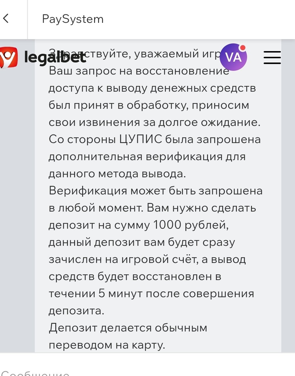 Ещё раз здравствуйте, в лс пришло сообщение, что я должен пополнить карту на 1000р, так и должно быть?