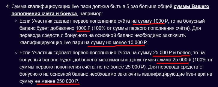 Сумма квалифицирующих live-пари должна быть в 10 раз больше суммы Вашего первого пополнения счёта.