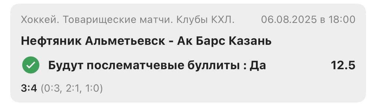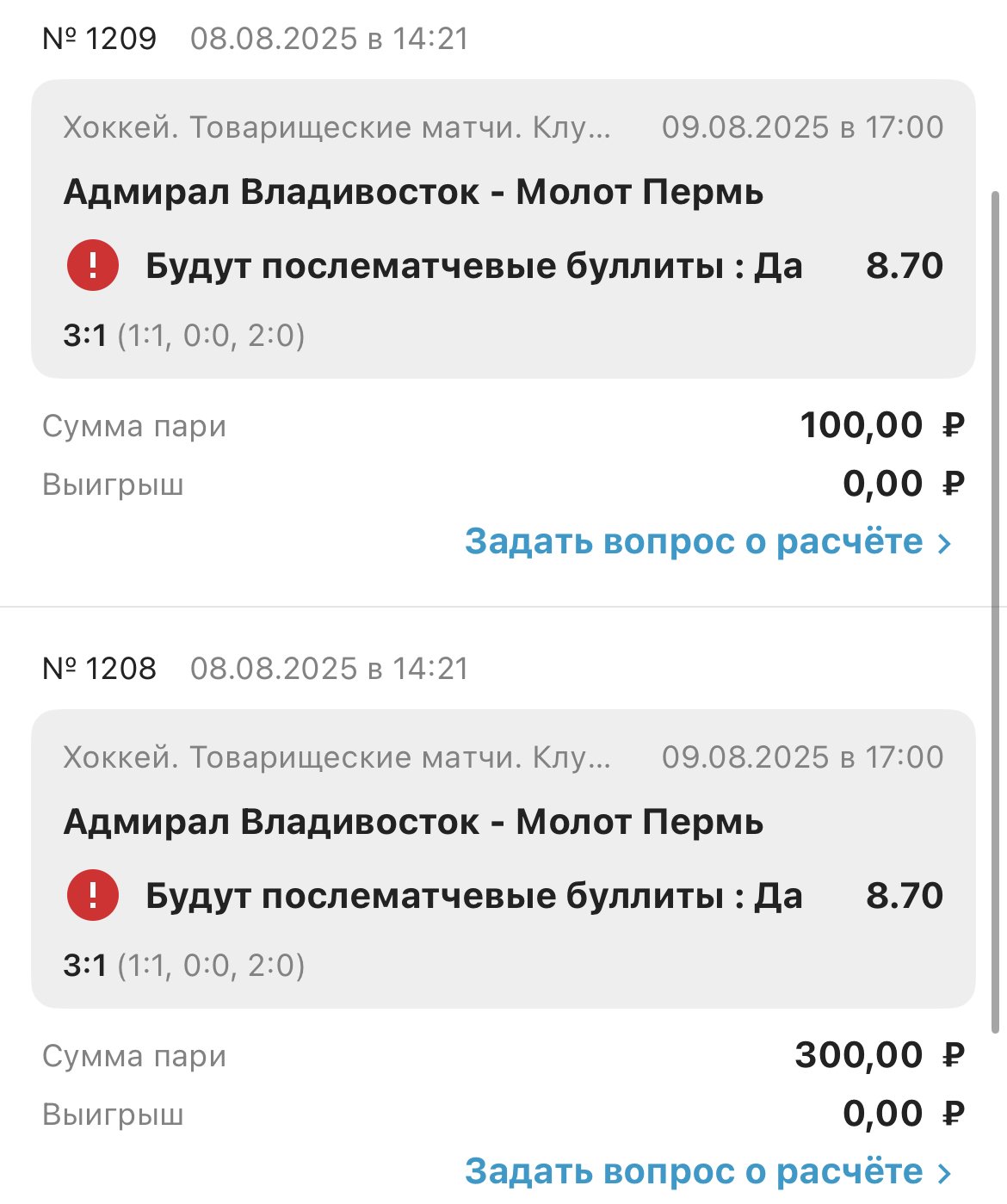 Здравствуйте! Поставил на товарищеский матч между командами хк «Адмирал» (Владивосток) - хк «Молот» (Пермь), матч состоялся на РЦОП «Раубичи». Я поставил на событие будут ли послематчевые буллиты (в условиях не было указано, что буллиты должны быть продолжением матча для выявления победителя, если бы было указано то вопросов нет) я посмотрел матч и в конце увидел как команды пробивают буллиты (чему очень сильно обрадовался, так как условия пари выполнены и ставка сыграла, но умники из бк решили иначе и рассчитали как поражение) так же решил поставить 2 ставки на авось победа по буллитам к1 и победа по буллитам к2 (по буллитам победила к2 «Молот») и снова бк рассчитывает как поражение, пожалуйста восстановите справедливость