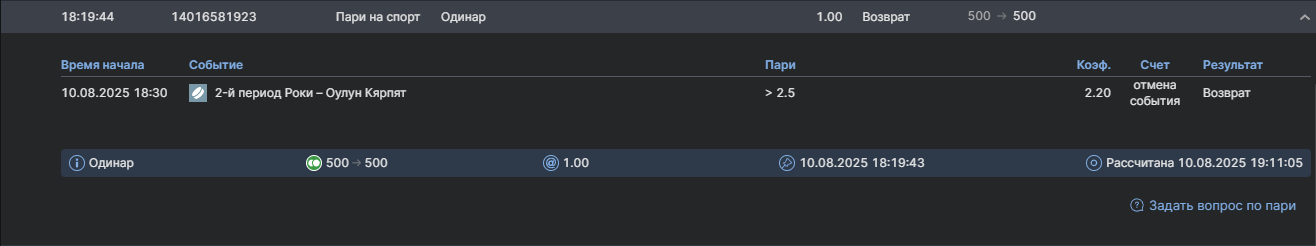 Здравствуйте, случилась неприятная ситуация с хоккейным матчем Роки - Оулун Кярпят. Ставил на тб 2.5 в 1 периоде(680)и во 2 периоде(500), после второго периода вижу, что бк сделал возврат ставки. Спросив у поддержки почему отменили матч ссылаются на то что играли Роки U18 - Оулун Кярпят U18, потом я попросил предоставить пункт правил по которому ясно, что они могут аннулировать ставку, ничего не предоставили и кинули в игнор. При этом в Винлайне(а так же бб) всё превосходно, ничего не отменяли и сами посмеялись с решения фона