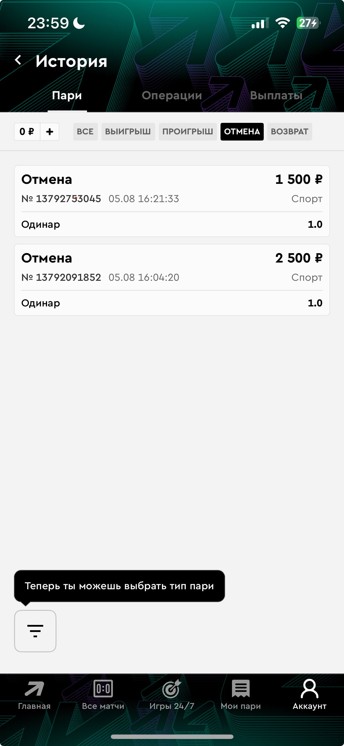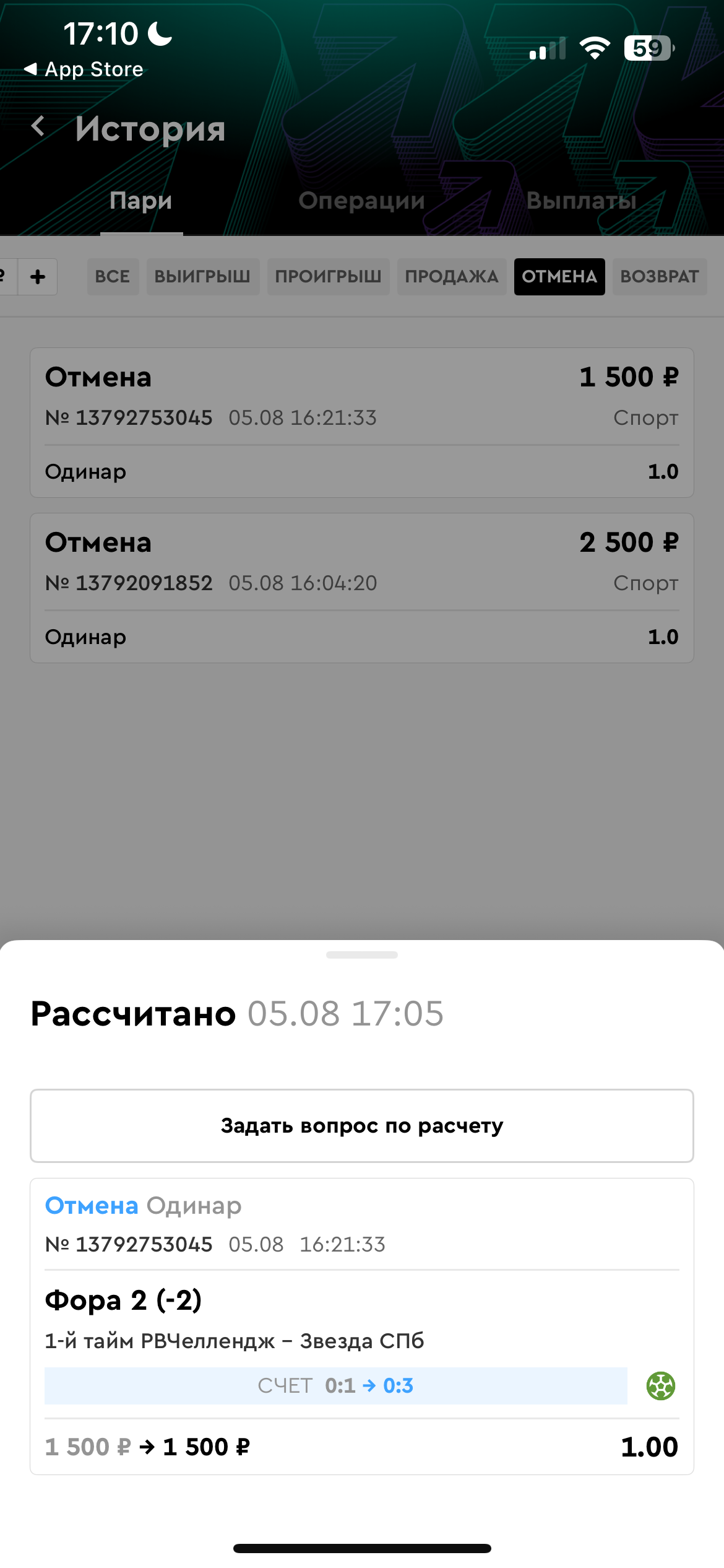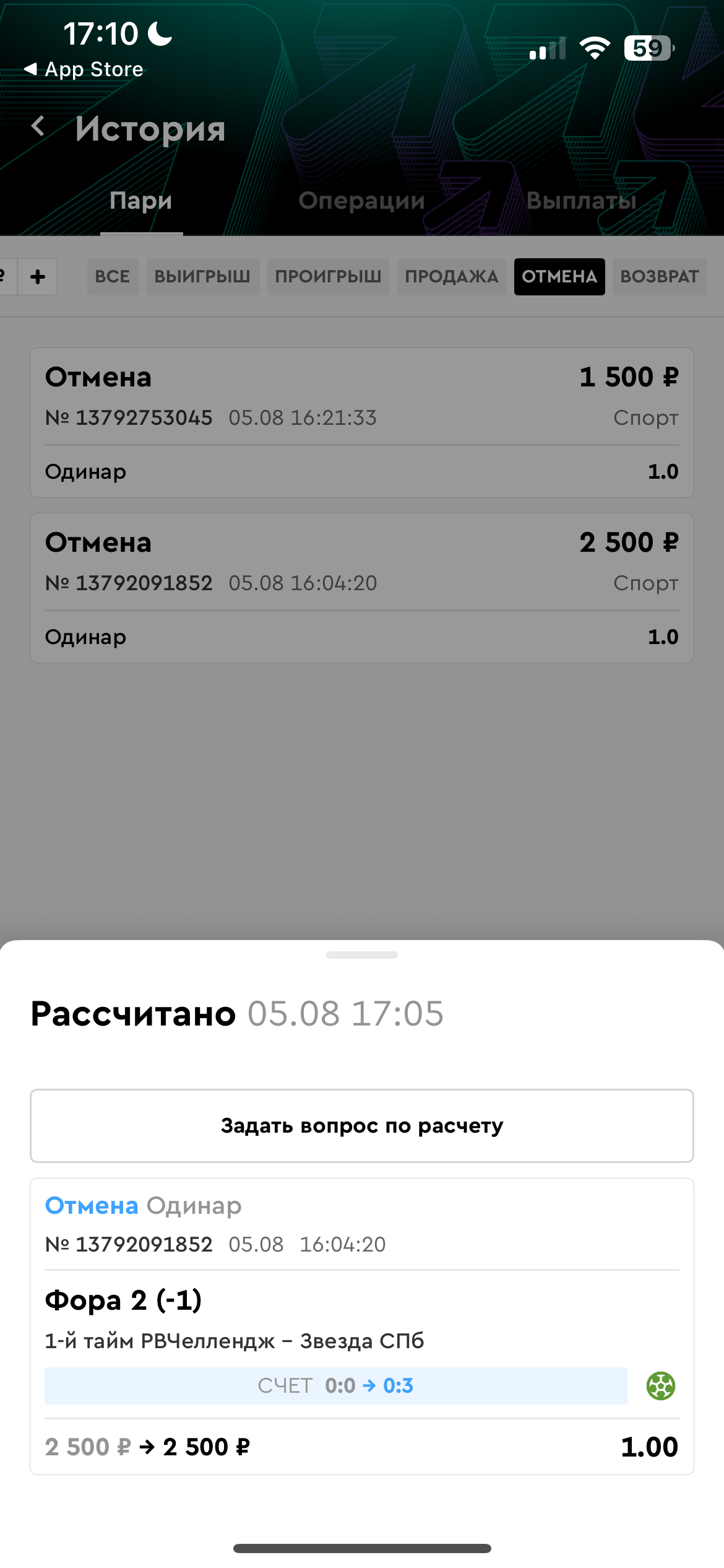Отменили по своим придуманным правилам, что матч возможно подставной. Убрали баланс в минкс, после чего отдельная ставка выигранная соотвественно ушла в отыгрыш этого минуса. В поддержке ответили, что так уж и быть пойдут на уступок вернут баланс в ноль. Ниже игрок тоже подавал жалобу на это, которую удовлетворили. Ставку на фолы при этом рассчитали победой.