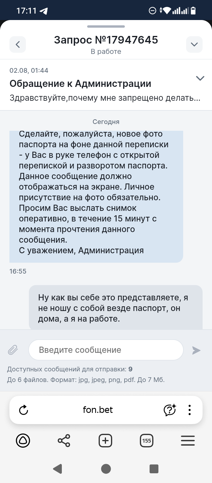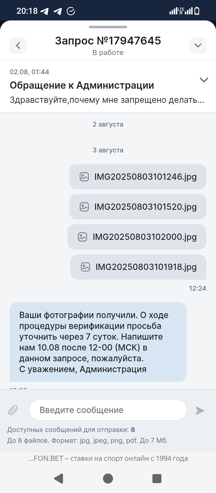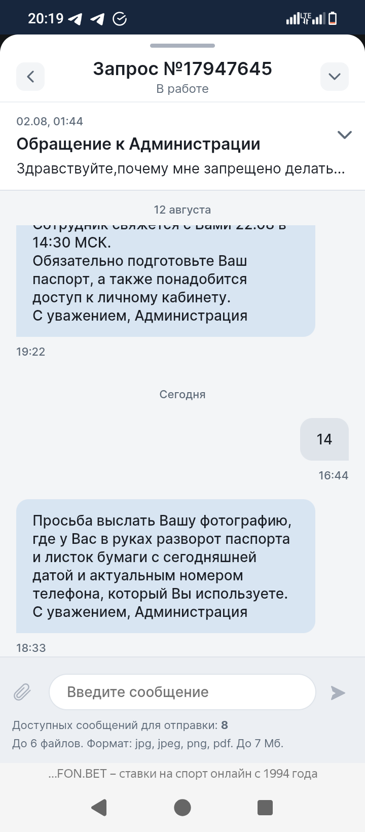 Здравствуйте ставил в конторе Фонбет, проиграл выигрывал, но недавно мне удалось выиграть миллион, и я получил блокировку 2 августа, к меня запросили различные фотографии которые я оперативно скинул, после чего мне сказали ожидать 7 дней, после 7 дней у мне назначили процедуру видео верификации, причем ближайшая дата была только 22 августа, а верификацию мне назначили 2го числа, вижеоверификации (допрос с пристрастием я бы это назвал) я успешно прошел, ответил на все вопросы, после чего мне сказали ждать в личном кабинете, я ждал ждал и тут мне пишут пришлите ещё нам одно фото где у вас в руках паспорт листок с датой и номером телефона. Вот а ***** ? Для чего? Я же отправил все фото и прошел видео где лично общался с их сотрудником. Я конечно сделаю это фото и отправлю, но боюсь, что Фонбет просто умышленно тянет время и удерживает мои средства. Иначе мне непонятно для чего это все. Пожалуйста помогите решить вопрос, мне мои деньги очень нужны