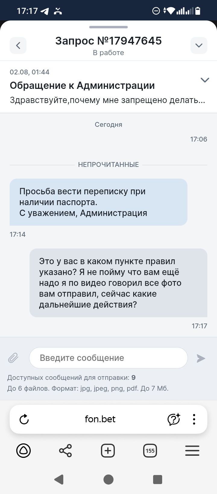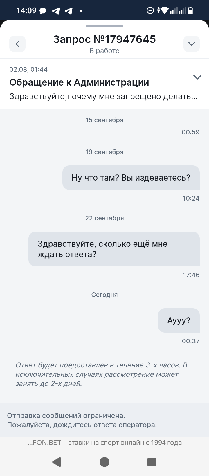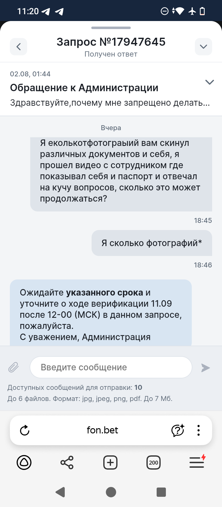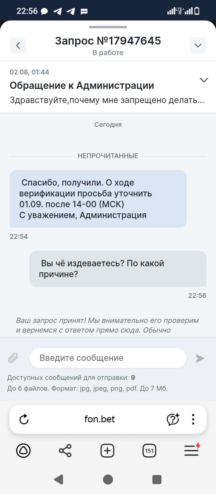 Здравствуйте ставил в конторе Фонбет, проиграл выигрывал, но недавно мне удалось выиграть миллион, и я получил блокировку 2 августа, к меня запросили различные фотографии которые я оперативно скинул, после чего мне сказали ожидать 7 дней, после 7 дней у мне назначили процедуру видео верификации, причем ближайшая дата была только 22 августа, а верификацию мне назначили 2го числа, вижеоверификации (допрос с пристрастием я бы это назвал) я успешно прошел, ответил на все вопросы, после чего мне сказали ждать в личном кабинете, я ждал ждал и тут мне пишут пришлите ещё нам одно фото где у вас в руках паспорт листок с датой и номером телефона. Вот а ***** ? Для чего? Я же отправил все фото и прошел видео где лично общался с их сотрудником. Я конечно сделаю это фото и отправлю, но боюсь, что Фонбет просто умышленно тянет время и удерживает мои средства. Иначе мне непонятно для чего это все. Пожалуйста помогите решить вопрос, мне мои деньги очень нужны