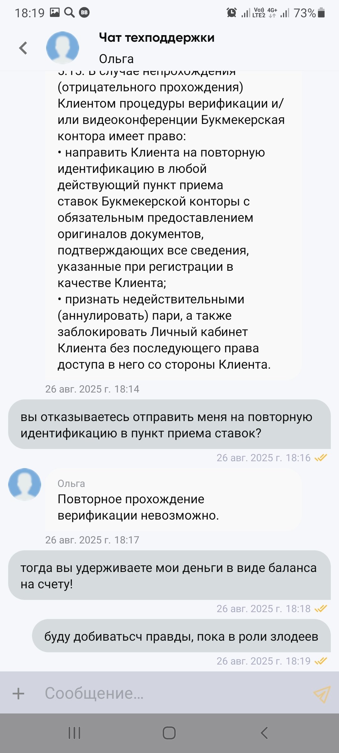 Здравствуйте, зарегистрирован по номеру 89256117449. Отправлял фото с листком бумаги, договор по номеру и прочее. Потом видеоверификация по ней сказали неуспешно, заблокировали- пытаются присвоить деньги и вот что отвечают. Что у них неуспешно?? Я на видео, мой паспорт и что что я не помню последнее пополнение когда и какая сумма. Вообще не обязан на это отвечать, мое право. Я на видео и я ставил! Все успешно. Воры и мошенники. Требую свои деньги. Посмотрите мой аккаунт это то ли 3 то ли 4 букмекер с верификацией своей. Во всех остальных все нормально решилось по справедливости. Честная игра, честный выигрыш будьте так любезны рассчитаться. Жду решения