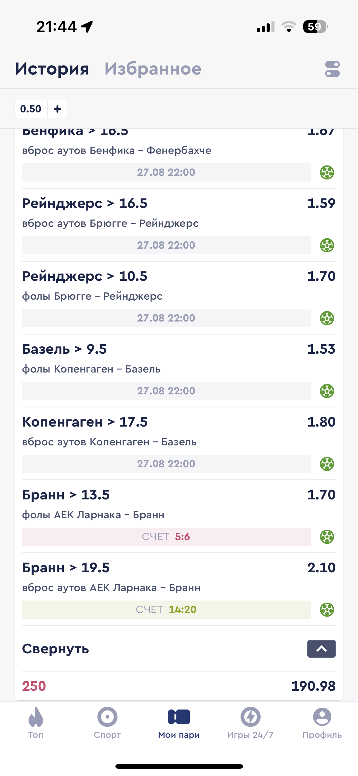 Матч Бранн - Ларнака я поставил на то , что Бранн сделает за матч больше, чем 13,5 фолов. А букмекер фонбет выдает результат в 6 фолов у команды Бранн.