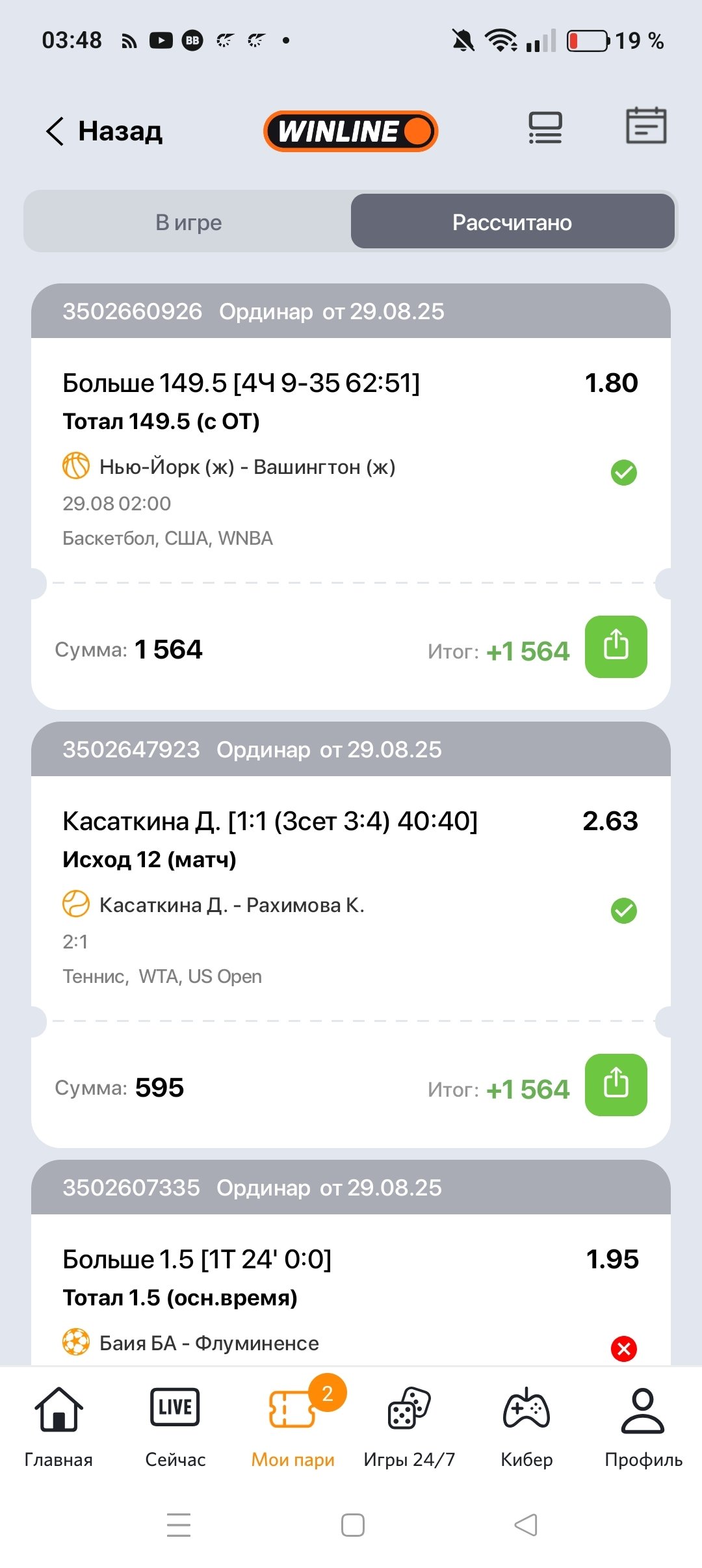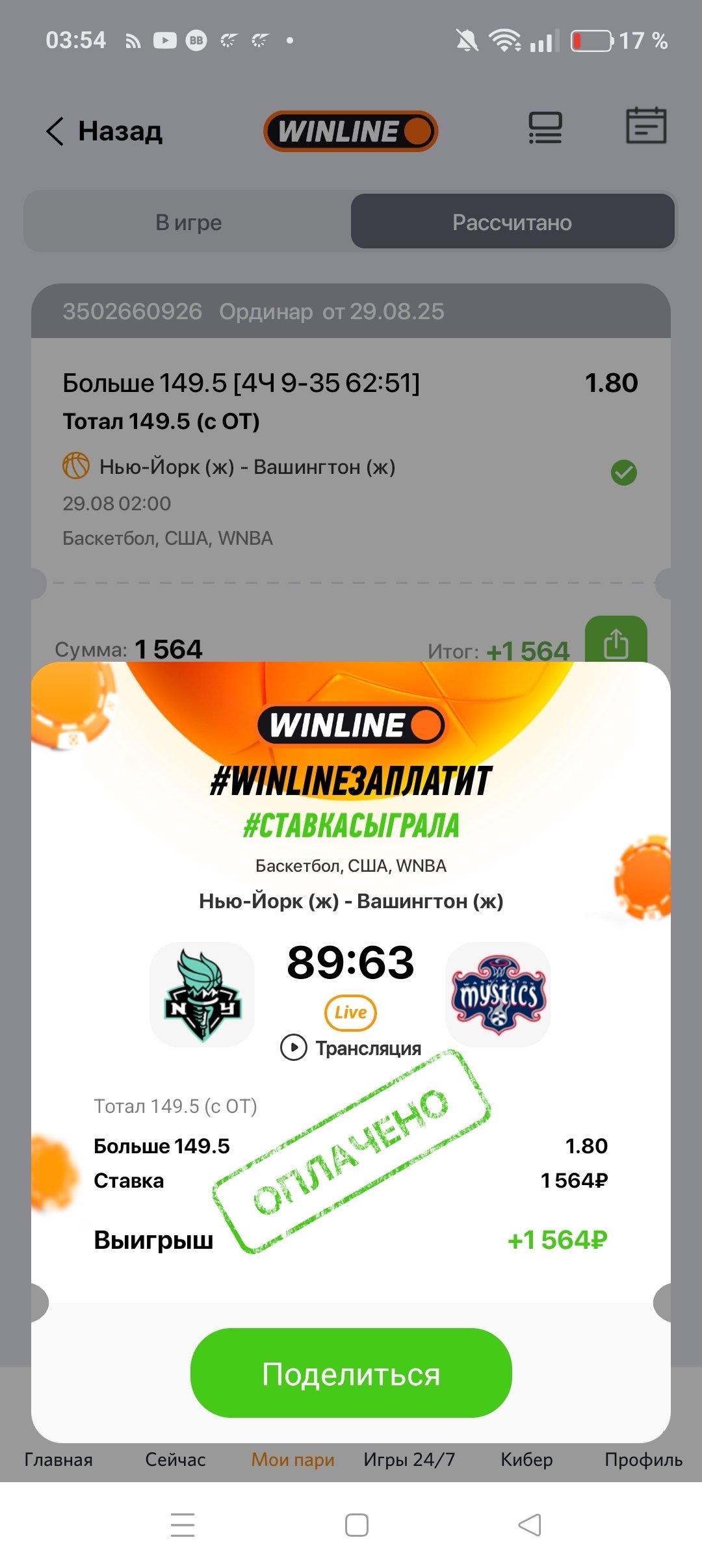 Очередной обман со стороны букмекерской конторы Винлайн,описываю ситуацию:В Женской WNBA была совершена ставка в 4 четверти на 9-35 до конца матча Нью-Йорк Вашингтон на тотал больше 149 ,следил за матчам в эфире,команды перестали забивать и тотал упал до 145 больше,думал уже ставка не зайдет ,дальше команды начали забивать и доступная ставка уже была , 154 больше и мне приходит расчет возвратом,спрашивается на каких основаниях,когда матч закончился со счетом 89-63 и моя ставка зашла!Прошу разобраться с этой вопиющей ситуацией и рассчитать мою ставку выигрышем!