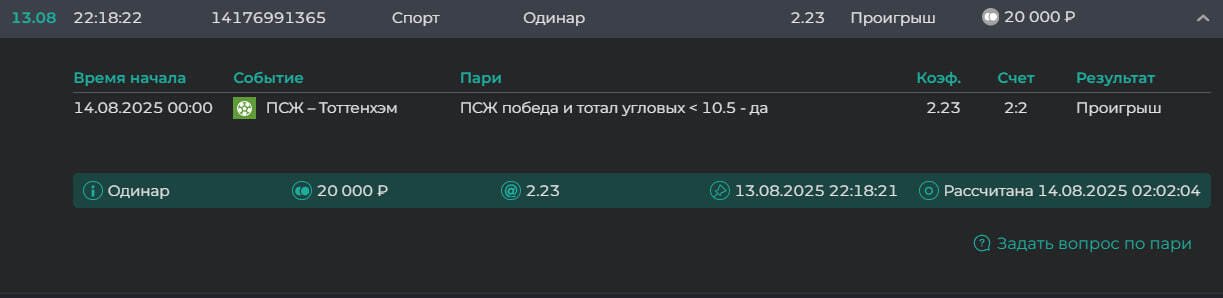 Требую пересчитать пари №14176991365 (событие: ПСЖ – Тоттенхэм, ) как выигрышное по условию: «ПСЖ победа и тотал угловых < 10.5» Основания: 1. Нарушение ст. 10 ФЗ-244: - В описании ставки «ПСЖ победа и тотал угловых < 10.5» отсутствовало указание на период матча. - Букмекер не проинформировал о применении правила об основном времени (п. 6.1). 2. Нарушение п. 6.1 Правил PARI: - П. 6.1 применяется только если условие пари содержит пометку «основное время» (либо ссылку на правило). - В моём пари такой пометки/ссылки нет → применение п. 6.1 незаконно. 3. Нарушение ст. 431 ГК РФ: - Неясность условий (отсутствие указания периода) трактуется в пользу игрока. - Требую расчета ставки по итогам всего матча. 4. PARI ввёл меня в заблуждение: - Интерфейс приложения не содержал указаний о применении п. 6.1 к данной ставке, - Несмотря на победу ПСЖ по итогам всего матча, пари рассчитано как проигрышное. Требую: 1. Пересчитать пари как выигрышное (с учетом победы ПСЖ в дополнительное время). 2. Выплатить 44 600 ₽ (20 000 ₽ × ) на игровой счет №60227427.