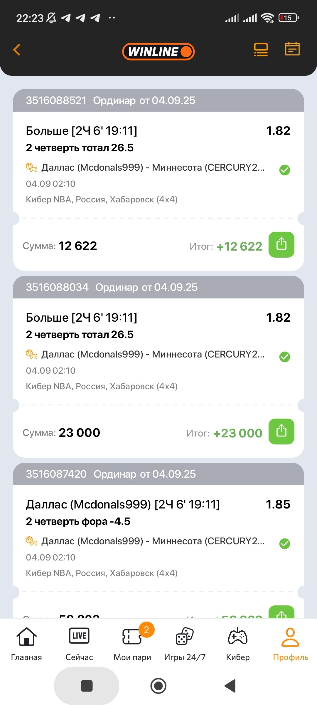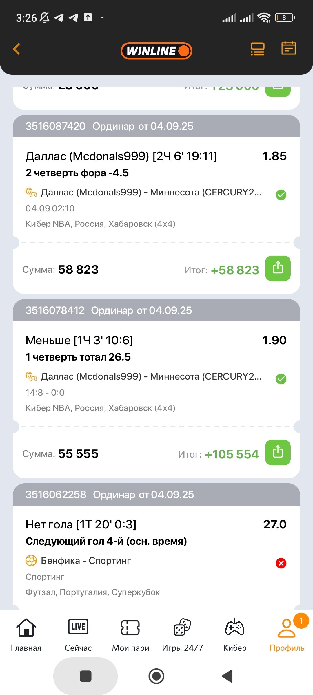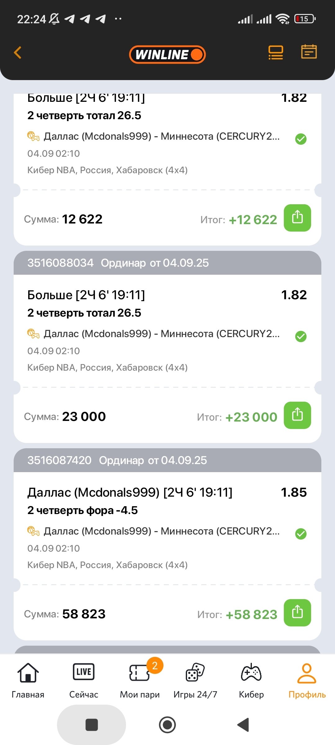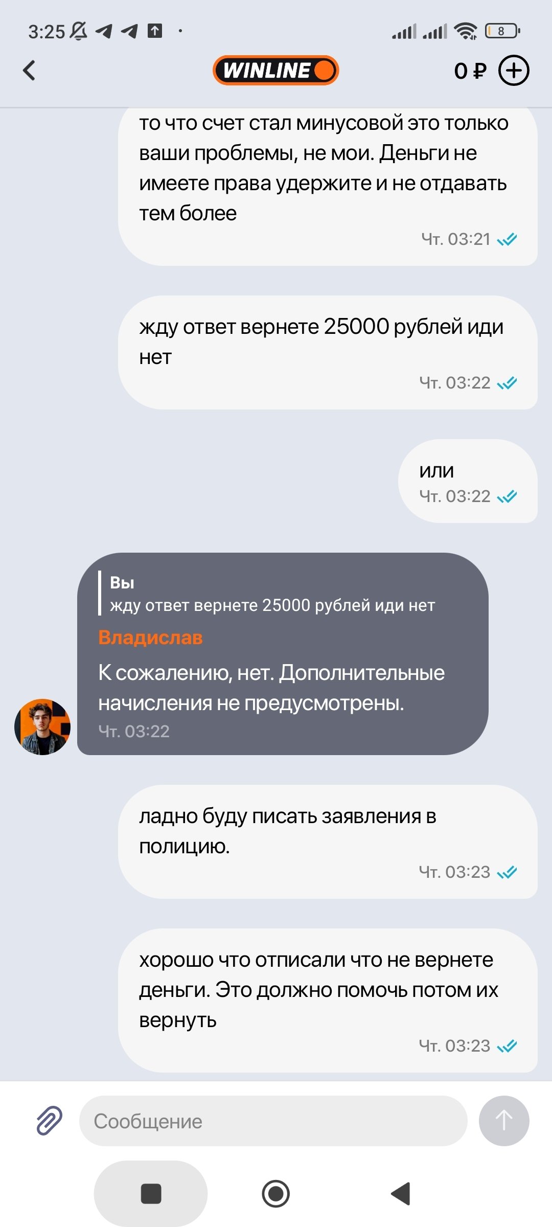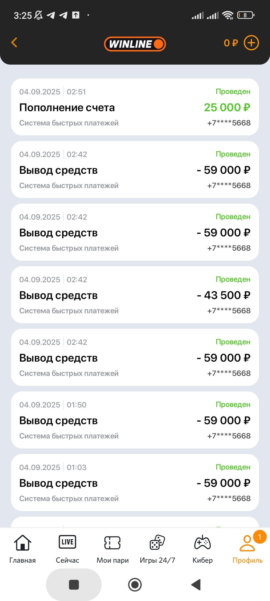 я обратился в службу поддержки по поводу моего счета в винлайне. С 3 по 4 число я ставил на кибербаскетбол и еще на футбол. Постепенно понемногу выигрывал и выводил себе на свой счет в озон банке, через СБП. При пополнении счета в винлайне в по уфе, числа у меня резко с нулевого счета, счет ушел в минус. Обратился в поддержку по данному поводу, мне ответился что они изменили часть событий на возврат как я понял, и счет увели в минус. Хотя я весь вечер постоянно играл, мне все расчитывали и все спокойно, постепенно выводили на мой счет в озон банке. Последняя операция так и числится 25000 рублей. Поддержка выдать мне деньги назад или зачислить на счет отказались. Хотя в переписке с минусового счета, сделали по нулям. Но деньги по транзакции от по уфе в размере 25000 рублей не зачислили. Прошу сделал запрос в букмекерскую службу винлайн, чтобы вернули мне мои деньги которые перевел им.