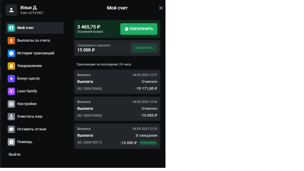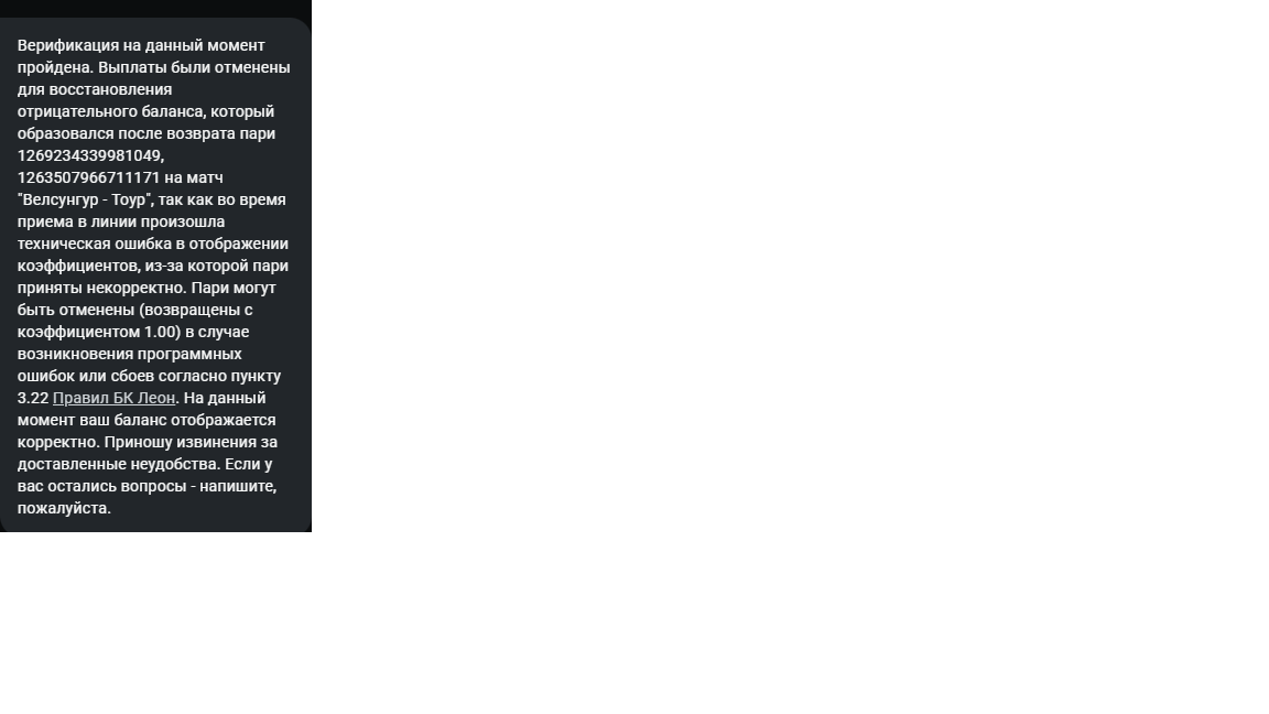 Здравствуйте,продолжение жалобы https://legalbet.ru/complaint/14329003/ Вчера пришло письмо,что верификация успешно пройдена, захожу смотрю все супер, на балансе есть деньги, вывод доступен.ставлю вывод.Через сутки захожу ,а у меня выводы отменились и просто с баланса пропали деньги,и последнее пари расчитано возвратом,подскажите, это равзе нормально? Я думал я и прохожу все эти верификации чтобы забрать свои деньги с баланса,а мне в последний момент просто их обнуляют