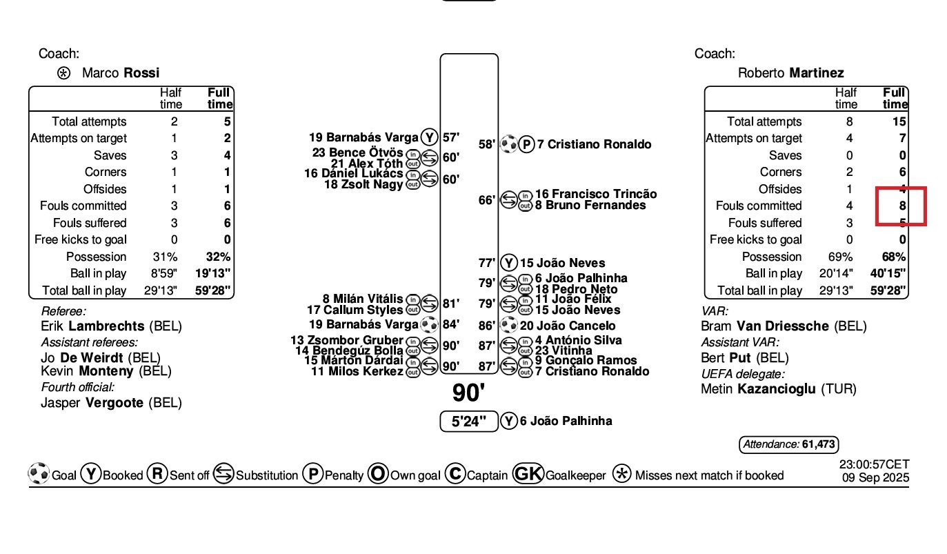Уважаемая редакция легал бет я столкнулся с очередным вопиющим случаем от олим бет, в матче Португалия - Венгрия я ставил на тотал фолов 8,5 б однако олимп рассчитал данную ставку проигрышем вот данные уефа Прошу пересчитать данную ставку выигрышем по сколько легал бет за честный спорт против обмана и жульничества