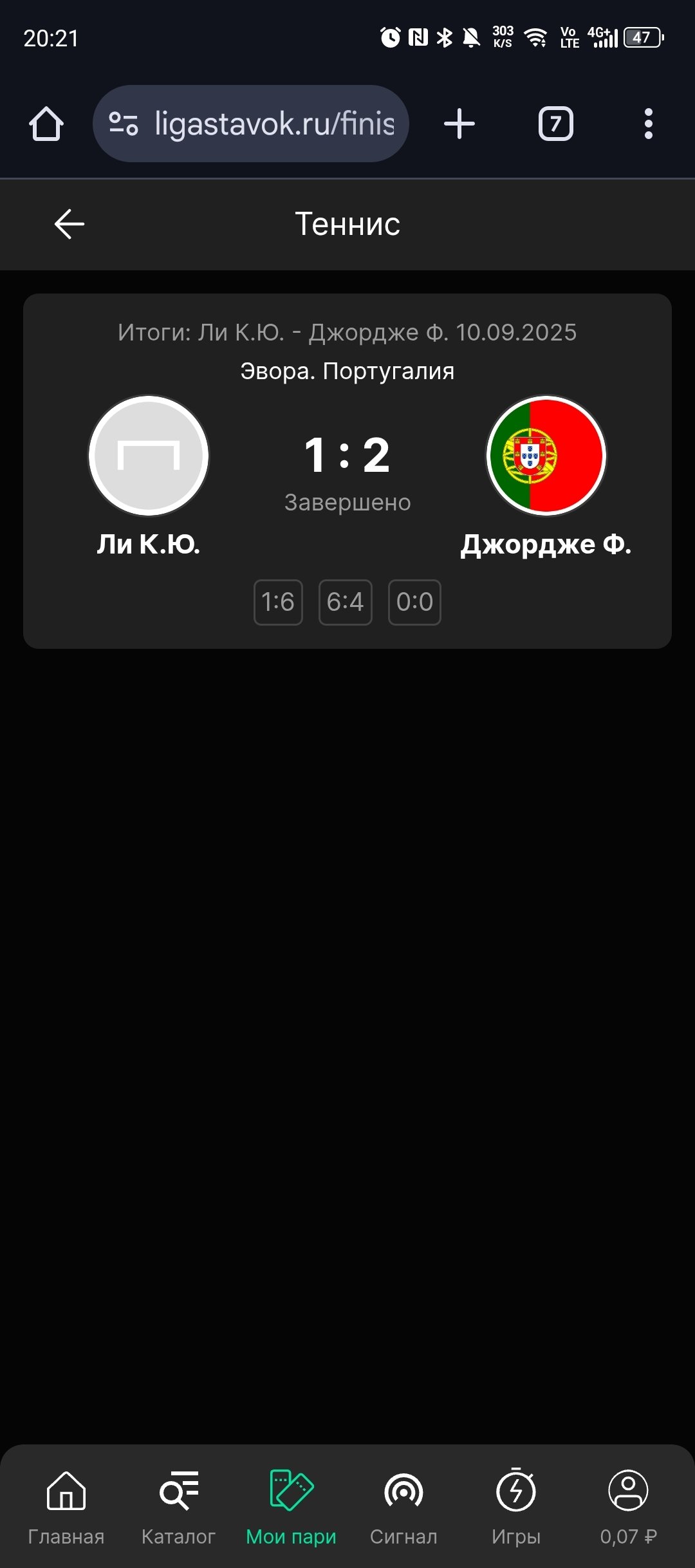 Здравствуйте, меня очередной раз подвел букмекер ЛИГА СТАВОК тем, что очередной раз предоставляет недостоверную информацию по матчам. Я сделал ставку на событие "теннис" на общую победу одного из игроков, при счете в Сетах 1:1 и начале третьего сета (счёт в третьем был Сете 0:0 , а по очкам 30:30). Я делаю ставку на общую победу, а потом вижу следующее: очки становятся 30:40, а потом игру завершают по счету в Сетах 1:2. И у них у самих на сайте написано, что игра завершена 1:2, счёт третьего сета 0:0.Т. е. ставлю на общую победу вначале третьего сета, а через минуту игра завершается. Так ладно они бы обосновали чем-то, так нет, они просто забрали деньги и провели мне про проигрыш моментально!!!! Поддержке без разницы что у них происходит, шаблоны кидают.Несколько суток ранее у меня была ставка, где игрок вёл со счетом 0:1 по сетам и почти выиграл второй сет и закрыл игру, как противник отказался, так че вы думаете, эти мне отмену провели, не смотря на то что мой фаворит прошел дальше по сетки и технически выиграл матч!! Лозунг этой компании - Клиент всегда не прав. Ладно бы сумма была внушительная, но они забирают у вас последние копейки, делая клинта не правым. ВЕРНИТЕ МОИ ДЕНЬГИ!!!!!!
