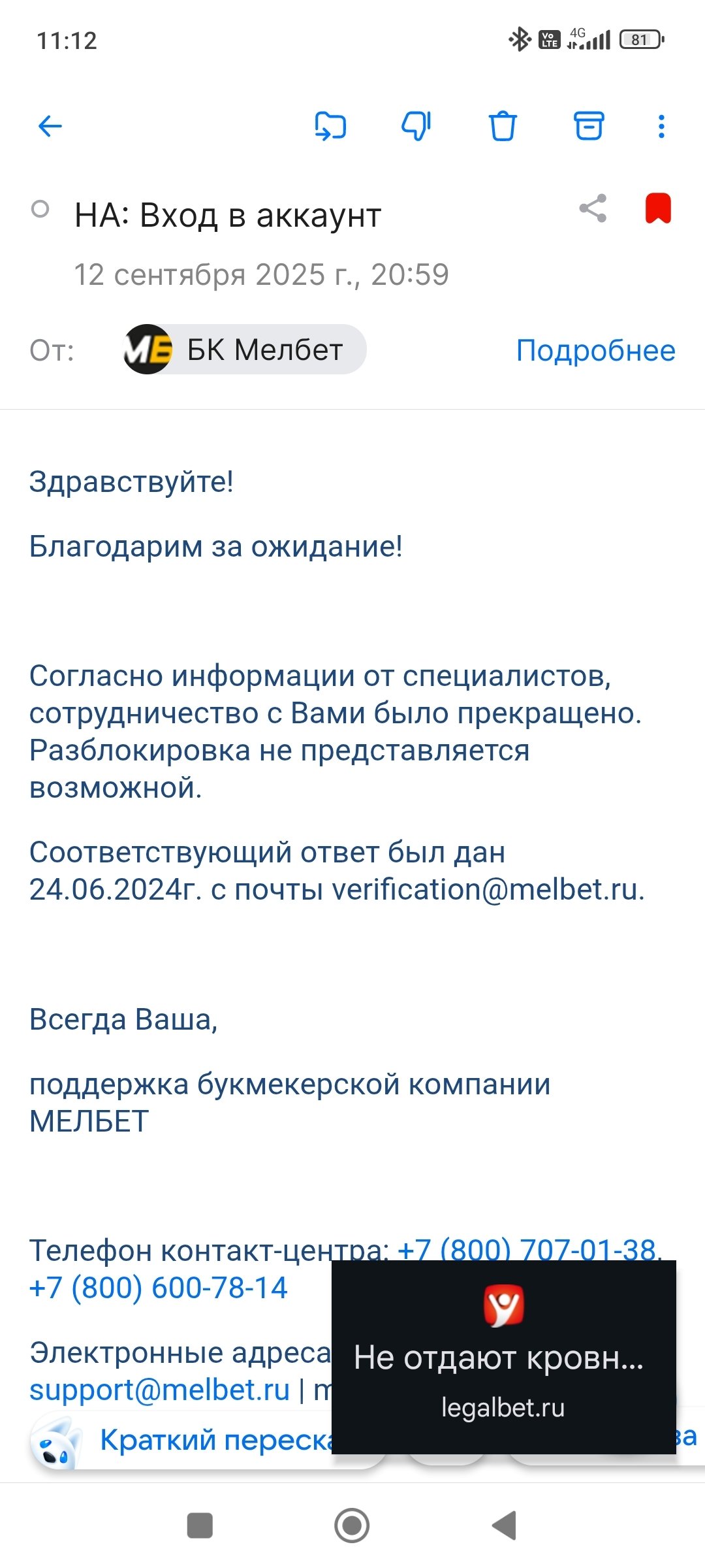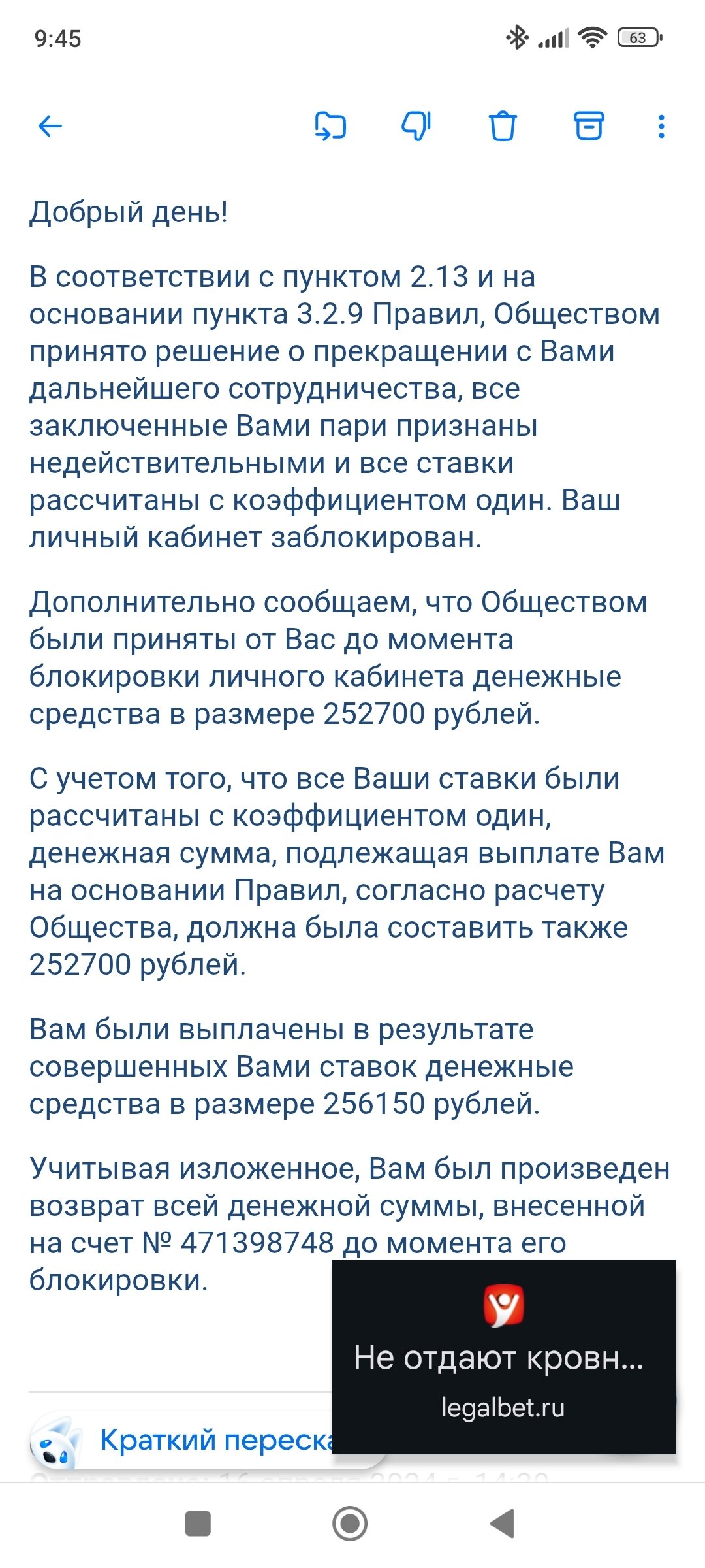 Заблокировали аккаунт. Притом причину так и не объяснили. Жаль, что прошло уже довольно-таки много времени с того момента, а я только недавно узнал про легалбет. Наверно, не будете рассматривать мою жалобу?(