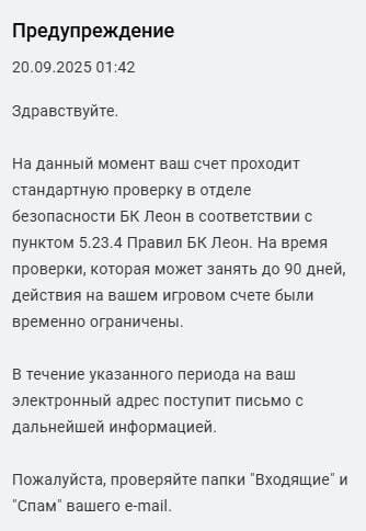 Прям перед самой блокировкой пришло уведомление пройти верификацию в приложение, фото паспорта и лицом покрутить, далее пришло сообщение, что документы проверены. Следующее сообщение: ваш счет проходит стандартную проверку в отделе безопасности БК Леон в течении 90 дней.