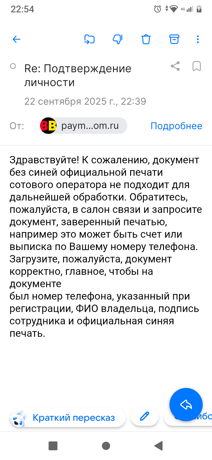 Здравствуйте,такая ситуация мне пришло уведомление подтверждение личности все документы практически прошли кроме оператора сотовой связи пишет что бы была видна печать я 3 раза скинул там все видно вчера скинул им саму печать договора и пока ответа нет и написал в поддержку пока тоже ответа нет прошу помочь разобраться по этому пункту номер счёта 678099 привязанный номер телефона 89586545881