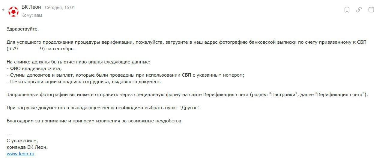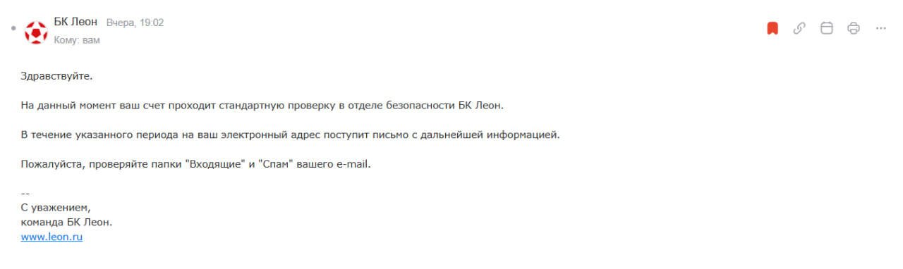 Проверка не завершена, сегодня получил на почту вот такое сообщение. Теперь пытаюсь заказать доставку оригинала выписки в Т-банке. Потому что БК Леон не принимает выписку в формате pdf.