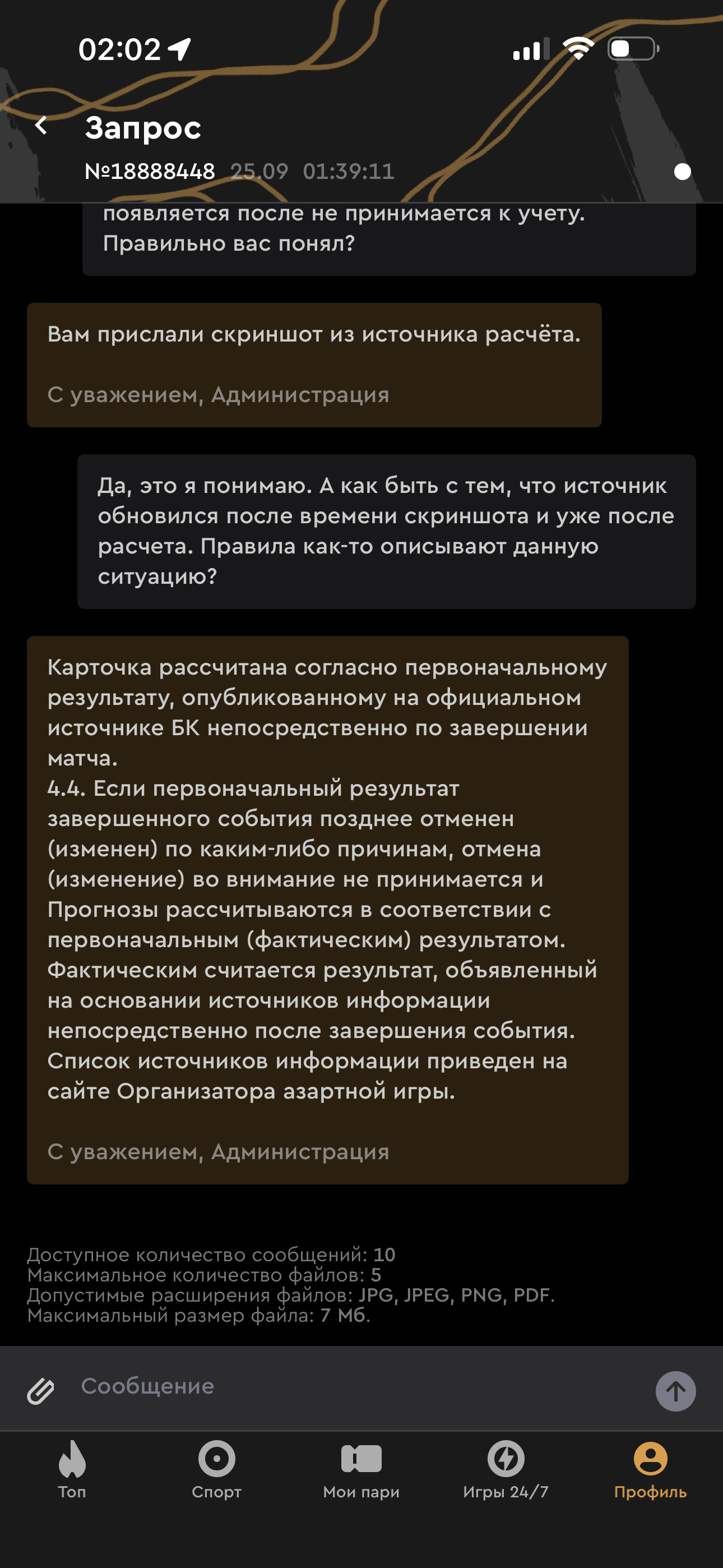 Добрый день! Букмекер Фонбет отказался принимать во внимание мой аргумент о том, что источник на который они ссылаются был не точен и не обновлялся в течении двух часов после конца матча Лиги Европы между Бетисом и Ноттингем Форрест, 24/09/2025. При этом, сами ссылаясь на данный источник они начали прикрываться пунктом правил 4.4, и настаивать на том, что их источник (скриншот с сайта УЕФА до обновления информации) актуален, даже не смотря на то что время моего обращения 01:39:11, что фактически на два часа позже их скриншота. Прикрепляю ниже ссылку на сайт, к которому и я, и Администрация делают отсылку: Прошу помочь разобраться в правомерности данного решения.