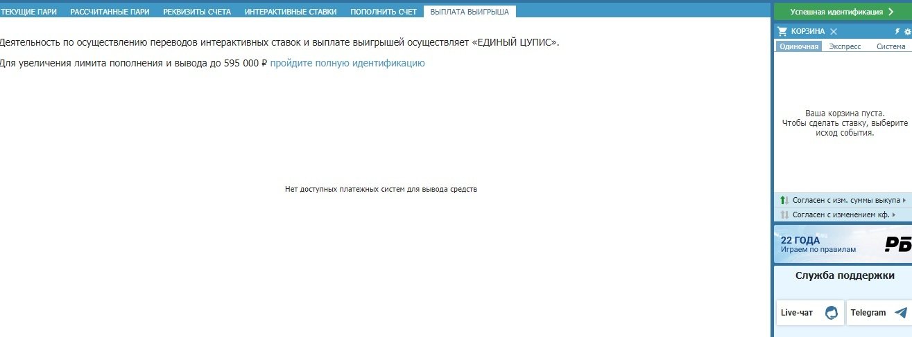 Здравствуйте, все было нормально, делал депозиты и выводы, но сегодня увидел, что нет платежных способов вообще пусто и задал вопрос поддержке как вывести деньги, мне ответили, что нужно пройти полную идентификацию через т-банк, я это сделал и появилась надпись успешно, но все равно не появились методы для вывода. Прошу помочь