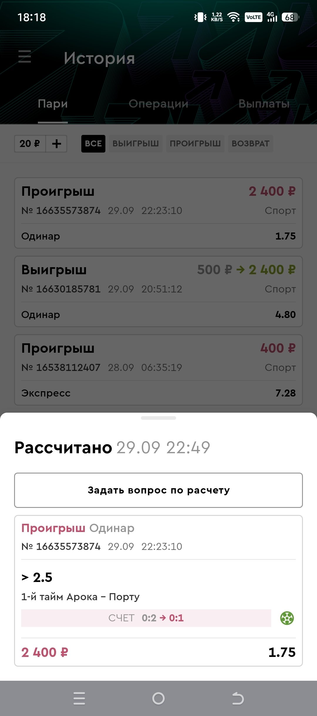 Зашёл на их сайт, увидел матч Арока Порту счёт 0-2 20ая минута , решил поставить 1ый тайм больше 2,5 , после того как ставку приняли, поменяли счёт на 0-1 . То есть поставил на кэф который давали при счёте 0-2, а по факту счёт был 0-1