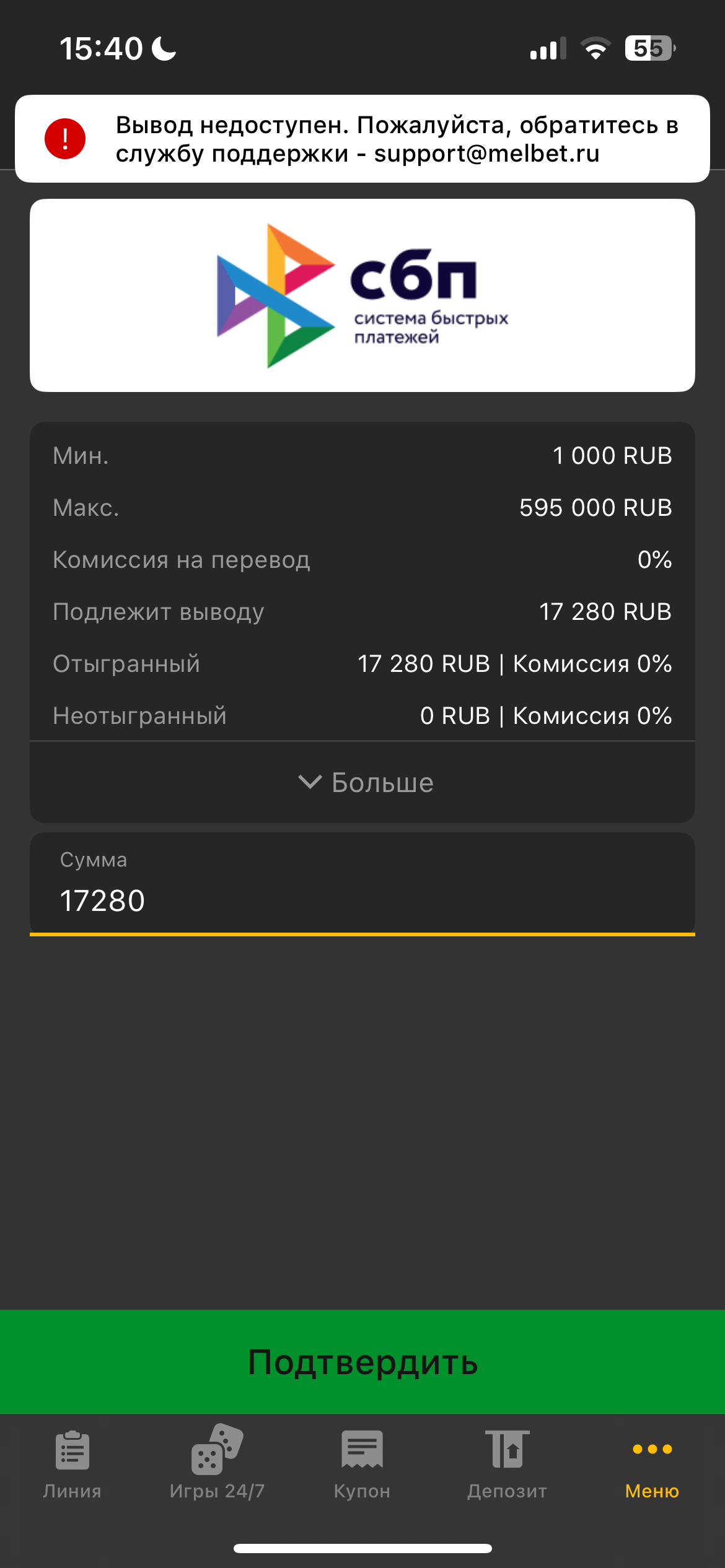 г Я совершил ставку и выиграл чуть более 17 тысяч рублей. После этого вывод средств был недоступен и мой аккаунт был заблокирован. Мелбет запросили документы, я отправил им несколько часов назад их. Жду ответ несколько часов. Букмекерская компания Мелбет ( город Москва, ул. Кржижановского, дом 14, корпус 3, пом. XVI ком 22.) удерживает мои деньги уже несколько часов. Жду решения вопроса в течении суток, или буду вынужден обратится в компетентные органы.