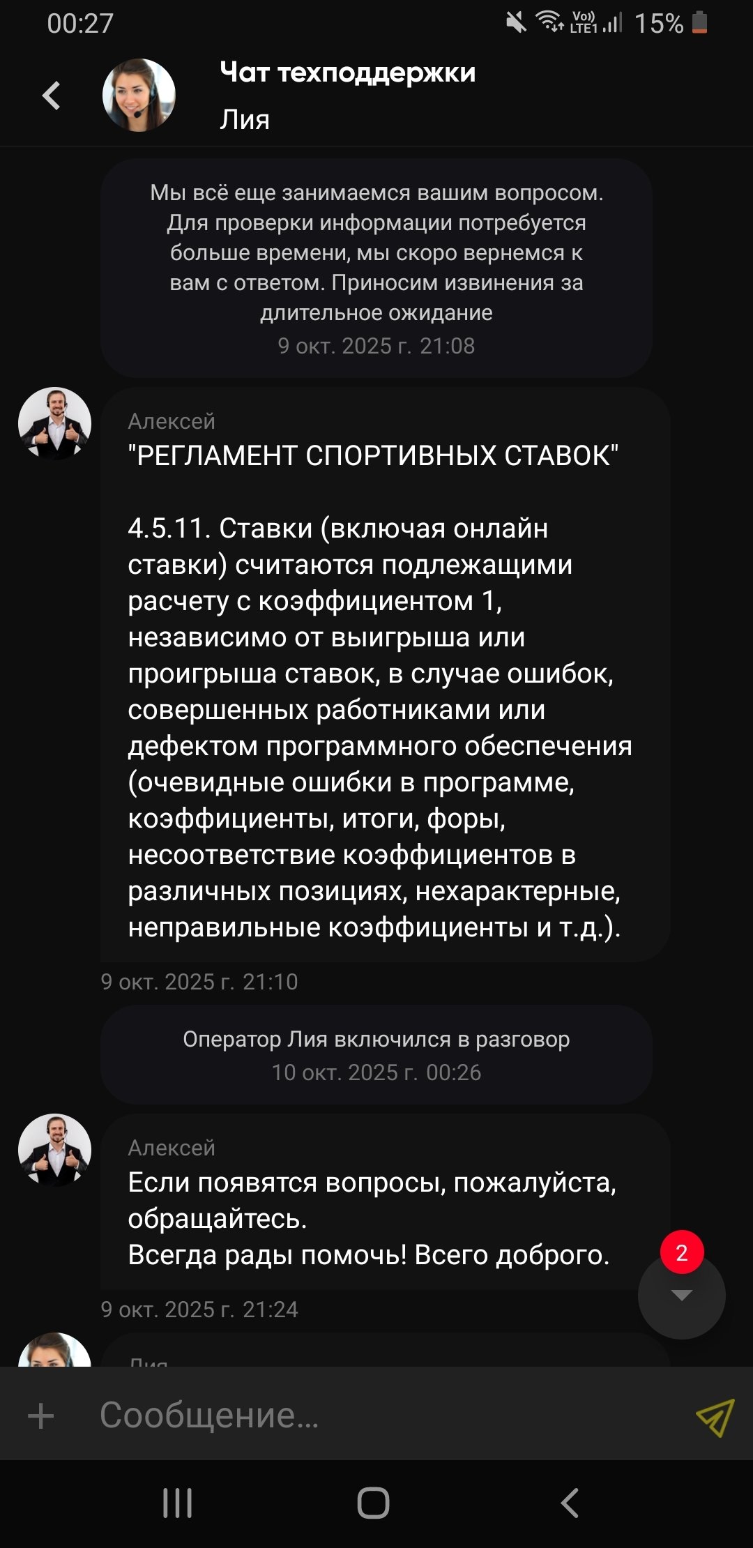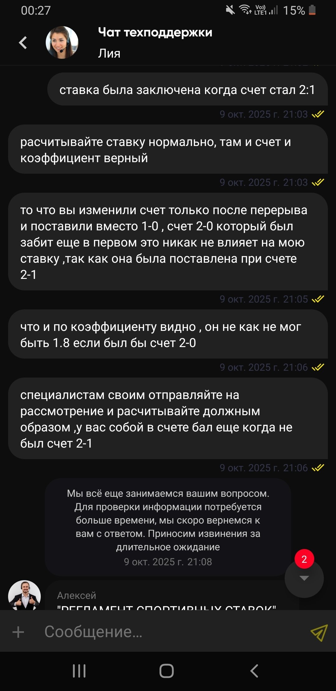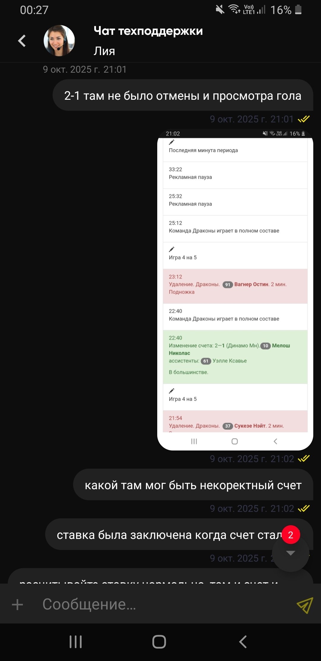 Матч КХЛ, между Шанхай и Динамо Минск , делаю ставку во втором периоде когда минск отыгрывает один гол, при счете 2:1 в матче , то есть во втором периоде 0-1 , коэффициент на тотал Минска больше 1.5 во втором периоде 1.8 ,как и должен быть , никаких видеопросмотров третьего гола не было, в бк он был выставлен нормально и дальше игра шла по нормальному , у них конечно был какой-то косяк что они после первого поставили счет 1-0, хотя в видеопросмотр был еще в первом ,но потом поменяли на 2-0 и открыли событие и потом динамо забивает свой первый гол и уже после гола я ставлю своб ставку , на что на 36 минуте вроде матча , в конце второго периода минск забивает гол 2-2 и моя ставка сыграла ,но заходя в историю ставок я наблюдаю О ЧУДО СТАВКА РАССЧИТАНА КАК ВОЗВРАТ ))) это уже не первая история с данной бк ,они очень часто любят рассчитывать ставки как хотят, пишу в поддержку ,где мне дают понять что ставка была поставлена при некорректном СТЁЧЕ, как такое может быть только их сотрудники знают,повторюсь никаких просмотров или еще чего не было ,ставку они вроде на 37 минуте рассчитали как возврат ,скриншот ставки и скриншот переписки прикрепляю ,так же скриншот официального протокола матча с кхл.ру