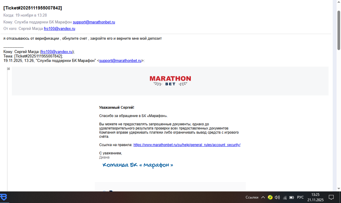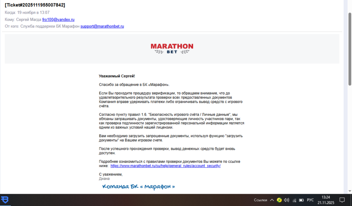 Здравствуйте , марафон запросил верификацию , сьездил в банк взял документ на котором есть ф.и.о., адрес , печать и роспись сотрудника , загрузил его на сайт марафона , + к этому еще паспорт и подтверждающий второй документ ( свидетельство о рождении) Марафон отклоняет документ банка и паспортные данные и так уже весь день , прошу помочь решить проблему
