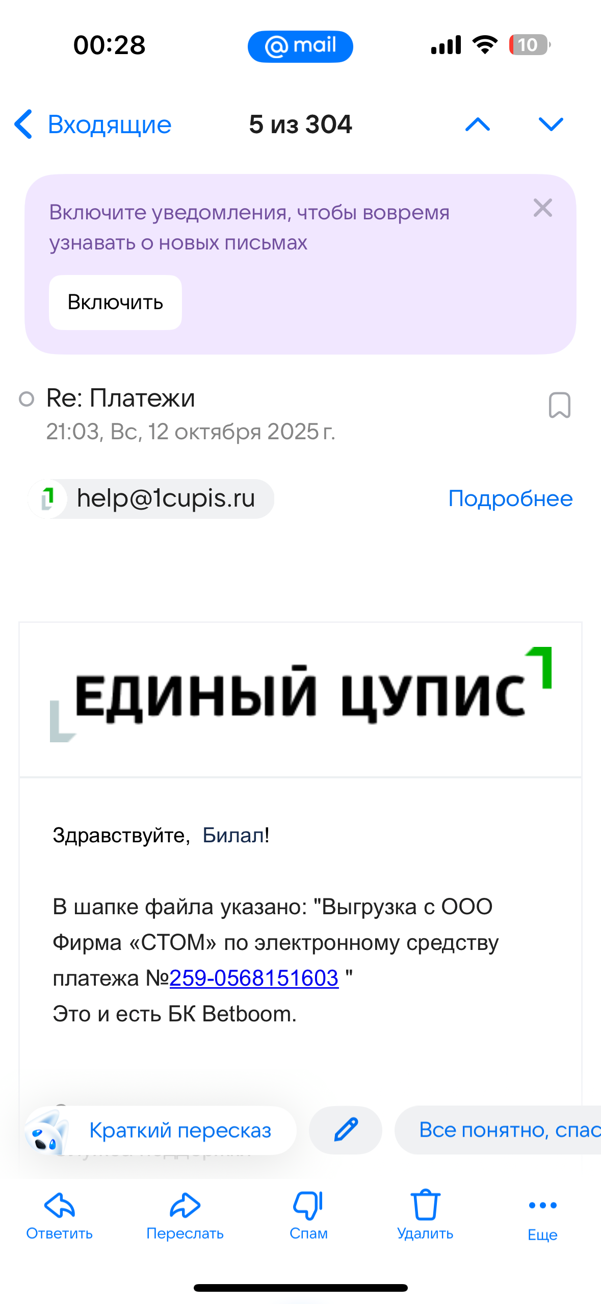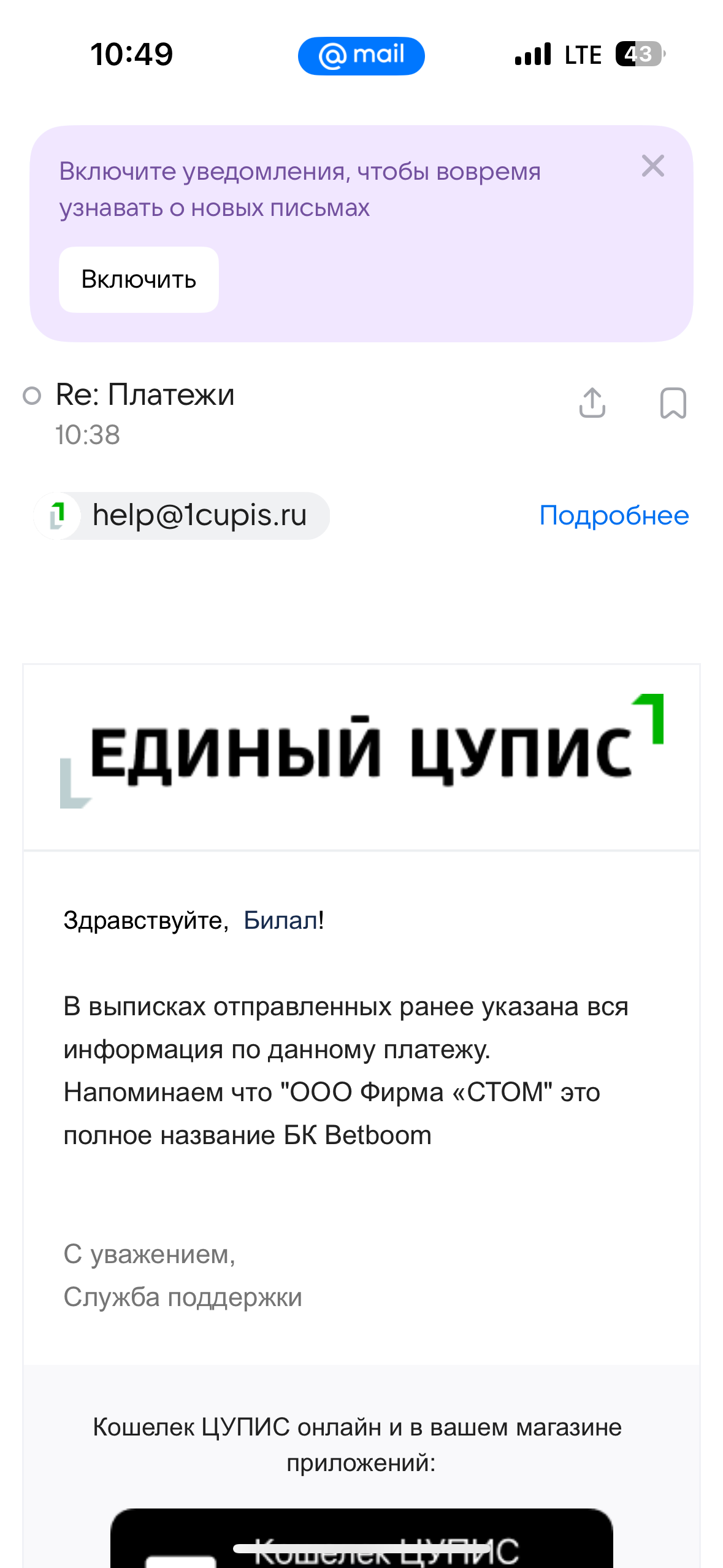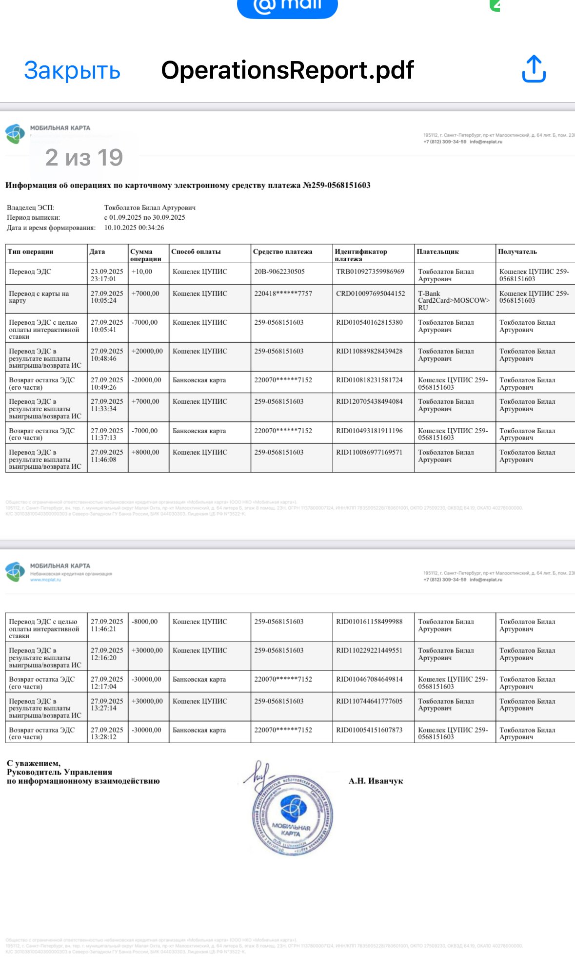 Здравствуйте, давно играю на конторе проблем не было раньше. Сейчас запросили верификацию вроде бы всё загрузил кроме одного фото его не принимают никак. Мне тяжело даётся это прохождение, раньше без проблем играл в конторе Пишет вот что: На документе одновременно должны быть видны печать, ФИО и транзакция. Поскольку пополнение было с использованием метода СБП, подтверди, пожалуйста, пополнения выпиской с указанием реквизитов карты, которая привязана к данному методу. Требуется именно выписка по счету, в которой будет отображена транзакция пополнения твоего счета BetBoom Изначально было загружено фото карты оно не принялось, потом выписка по карте за определённый период не принято, потом чек за транзакцию на пополнение через СБП метод, всё не принялось. Позвонил в Бетбум, оператор сказал можно скриншотом с телефона и тоже как то не прошло! В цупис сказали что такой документ развёрнутый где всё это видно не предоставят. Вообщем дайте точную информацию как откуда снимок должен быть или каким образом его сделать или дайте другой вариант прохождения пожалуйста. Мой I’d 1530795 Второй момент просят справку выписку с оператора связи , справку заказал говорят номер должен быть оформлен на меня , номеров пользуюсь почти 2 года он оформлен на брата мы живем в деревне у нас рядом нет офиса мегафона в 250 км от нас есть , туда возможности поехать нет , объясняю им не могут войти в положениеВсе данные логины пароли входы паспорт брата есть