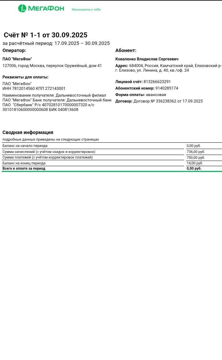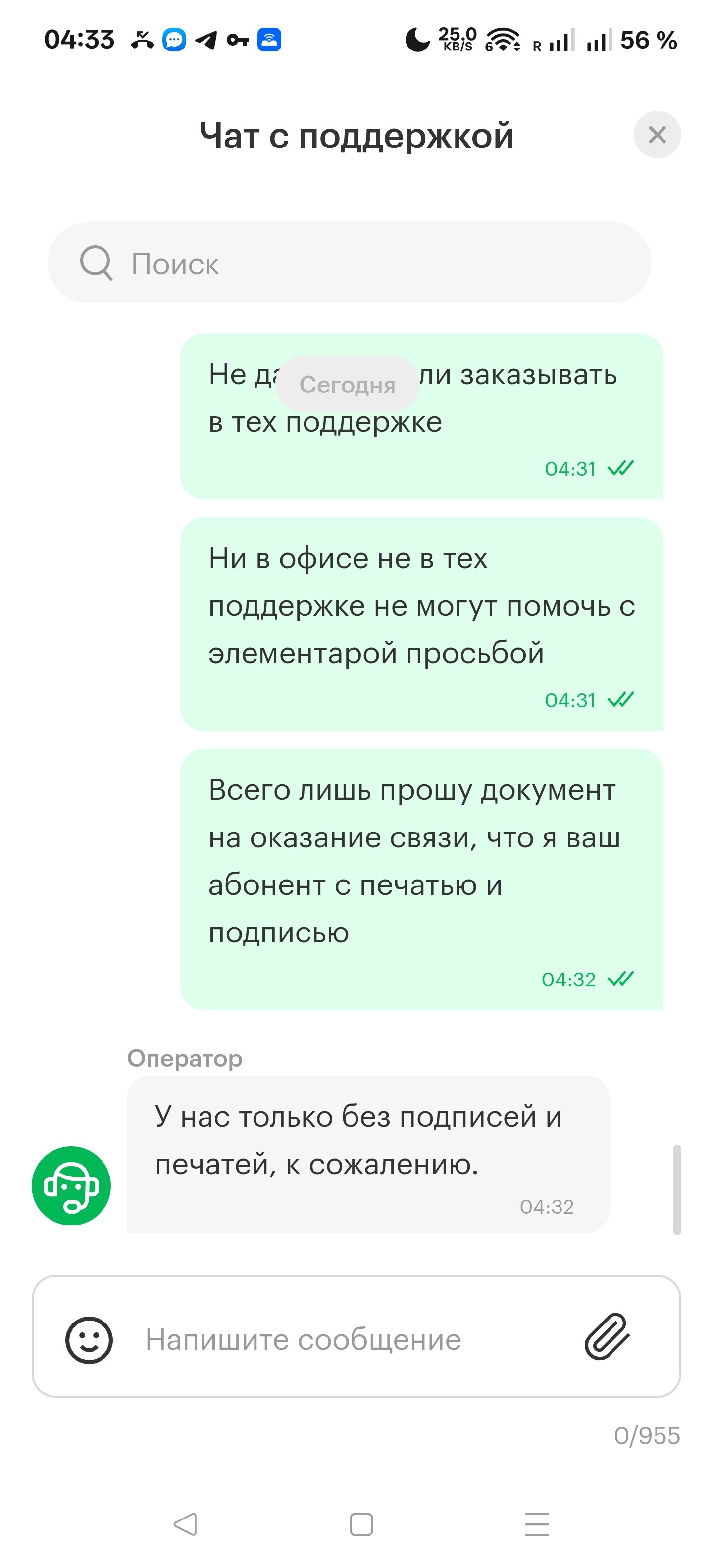 Здравствуйте, помогите с решением проблемы. букмера назначил процедуру верификации, необходимо приложеть договор об оказании услуг сотовой связи с печатью и подписью. я перенес свой номер телефона и тариф с оператора ТЕЛЕ2 на МЕГАФОН.какой либо первоначальный договор в день подключения в офисе мне не выдали. Сейчас повторно я пришел в офис чтобы взять данный договор но мне отказали, в чате поддержки мне также отказывают, говорят что такая услуга не предусмотрена, получилось заказать справку счёт где указана мои ФИО, лицевой счёт, номер телефона. но договор у меня не получается получить для прохождения верификации. Приложил скрин счёта по мегафону который мне предоставили в чате поддержки.Помогите пожалуйста с решением данной проблемы