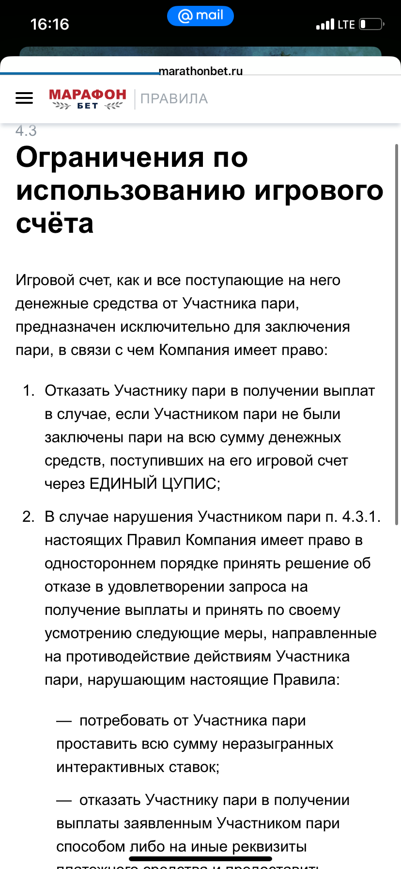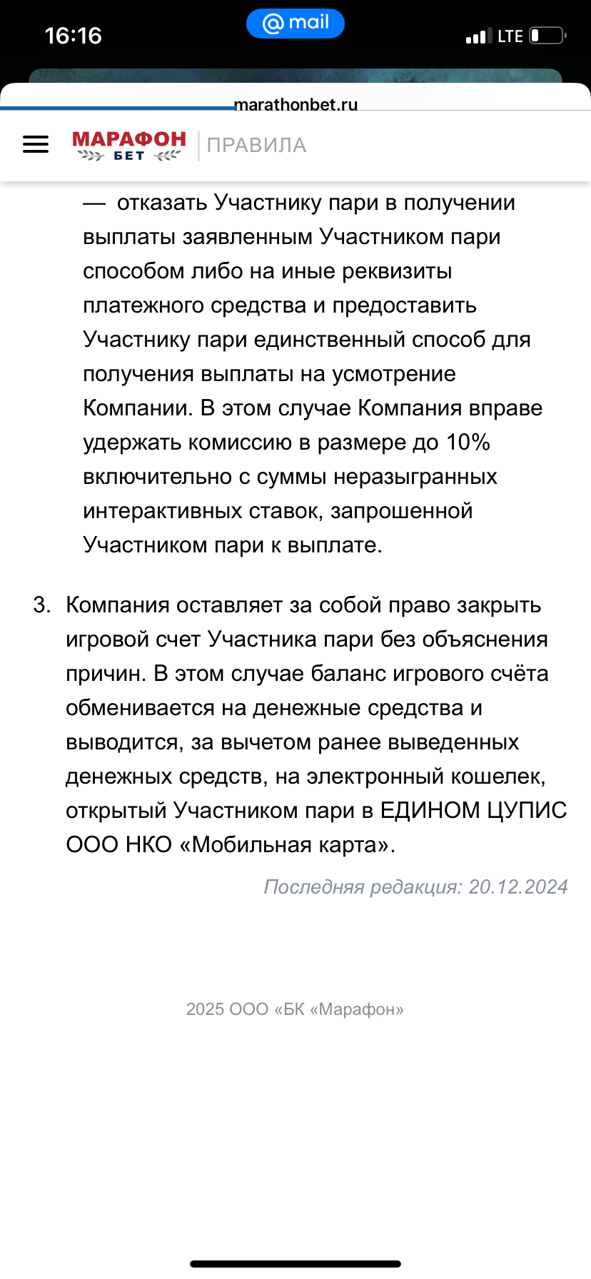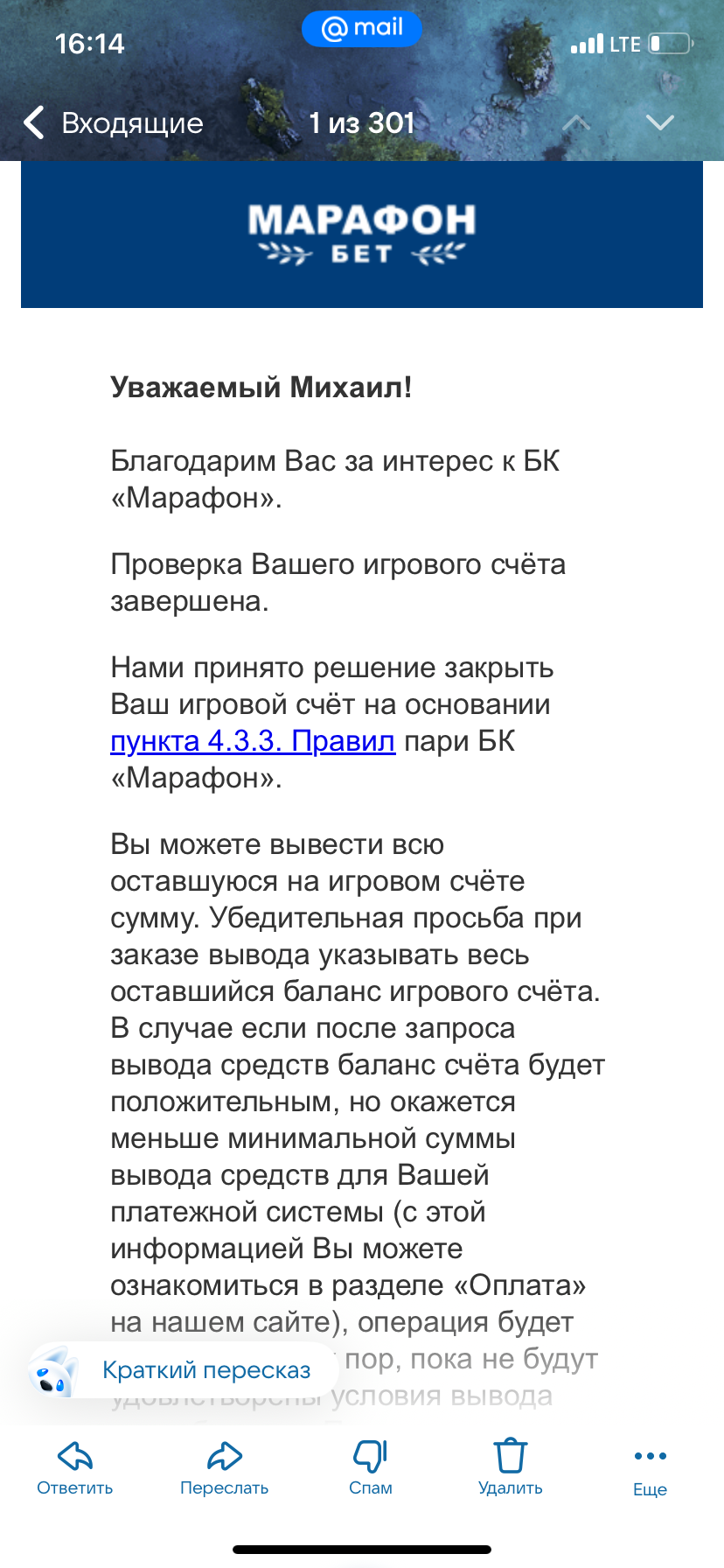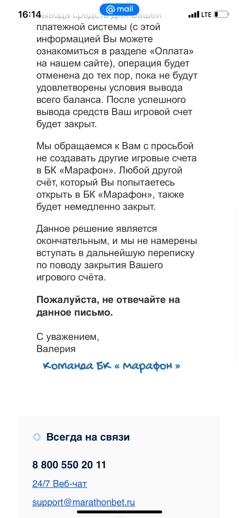 Более подробную информацию по ситуации Вы уже получили на электронную почту, привязанную к игровому счету. Мы обращаемся к Вам с просьбой не создавать дубликатных игровых счетов в БК «Марафон». Любые новые счета, созданные Вами, будут закрыты. Данное решение является окончательным, и мы не намерены вступать в дальнейшую переписку по поводу закрытия Вашего игрового счёта. Приносим извинения за неудобства и рассчитываем на Ваше понимание.