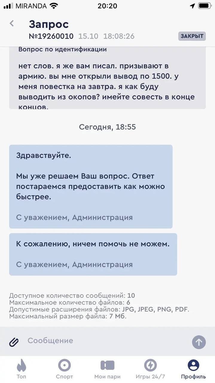 Играю недавно. Баланс счета 96 тыс. Прошел видеовериф сегодня. До этого неделю морочили голову с фотками. Открыли вывод по 1500 в день. Но дело в том, что у меня на завтра повестка в армию. И я им об этом писал и даже фото повестки скидывал. Неужели надо напоследок испортить мне все настроение. Как я буду оттуда выводить? В окопах интернета нет. Помогите пожалуйста. Больше обратиться некуда. Надеюсь на вашу помощь.