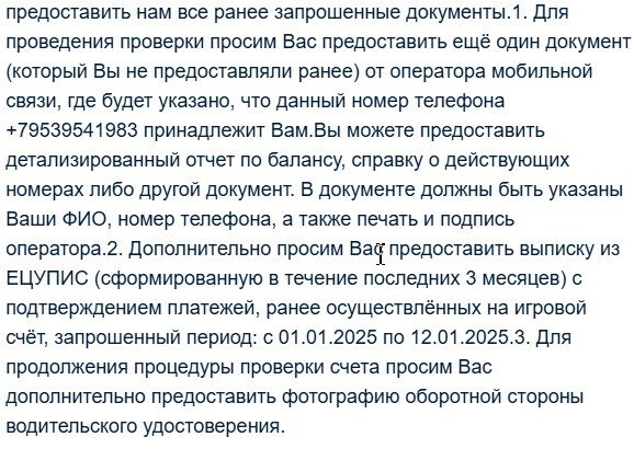 Здравствуйте, Legalbet!Постараюсь кратко и по делу:-регистрация в бк Марафон-депозит в 15000руб-выигрыш считанных тысяч руб. Запрос верификации-все запрашиваемые документы были отправлены. Далее начинается: прислать еще раз, дополнительный документ и тд. Я родилась в Донецкой республике, последние годы проживаю в Тульской области. Уже много месяцев назад вернулась к волонтерской деятельности для помощи своему родному краю. Часто нахожусь в прифронтовой зоне. Волонтеры не отличаются большим достатком, это не секрет. Поэтому вернуть свои 15000 очень было бы к месту.Я не прошу ничего у бк Марафон, эти выигранные 3000 руб пусть оставят себе. Разрешите мне вывод своих!!! 15000 руб. У меня совершенно нет времени ходить по салонам связи, просить там дополнительный документ, подтверждающий номер и так далее.Для информации Legalbet: все необходимые документы были предоставлены (паспорт, справка подтверждающая адрес регистрации, договор с оператором сотовой связи, селфи с документами). Все им было выслано, далее от них идет неадекват в запросах. Букмекеры бьют рекорды прибылей и не могут отдать чужие деньги. Как не стыдно. Я на свои деньги солдатам продукты покупаю!Подчеркну, что речь идет о выводе моих же денег.Прошу Legalbet повлиять на бк Марафон, а бк Марафон включить совесть.