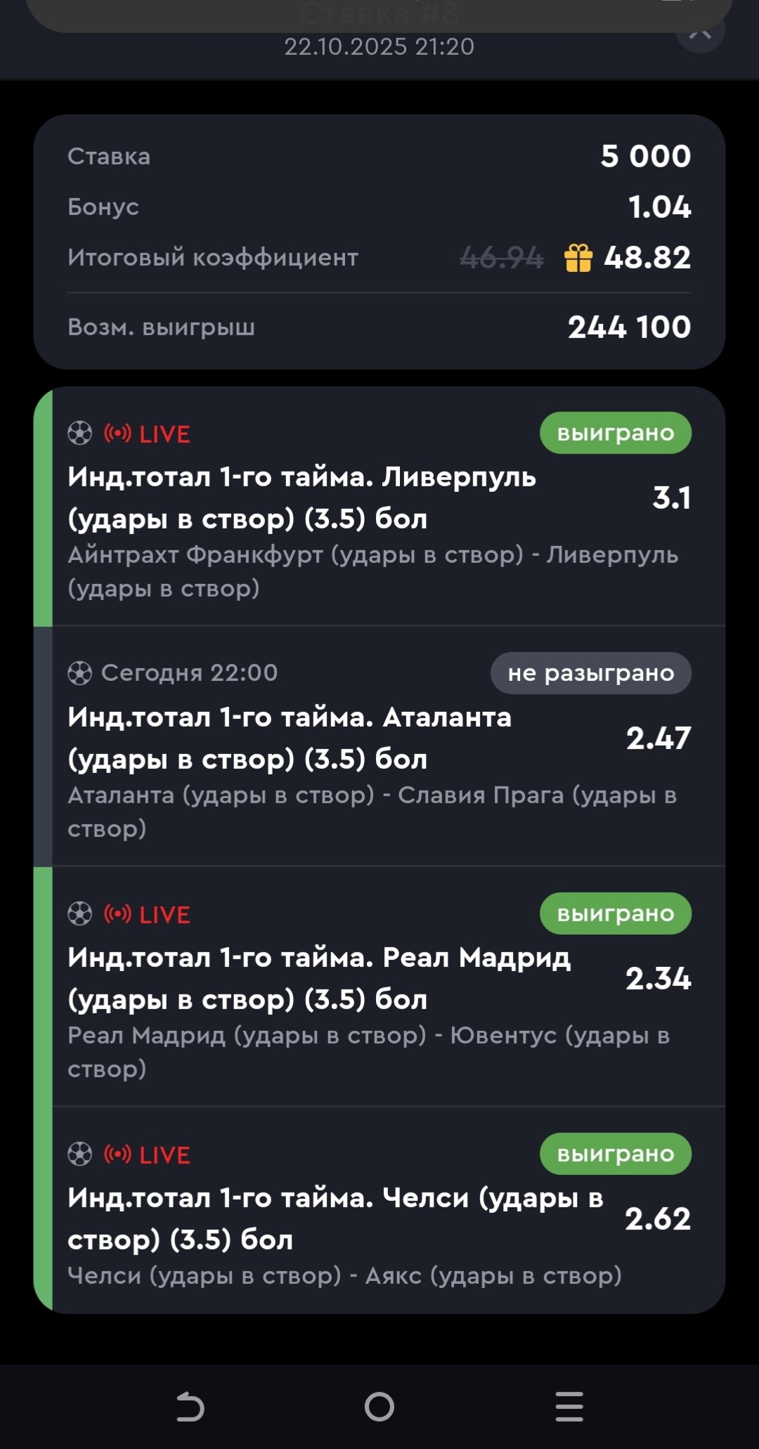 года в часов совершил ставку экспресс на 4 события на 1 тайм (удары в створ). По окончанию бк одно событие не засчитал, соответственно весь экпресс был проигран. Согласно статистики матча в бк мой экспресс должен был быть выигрышным но каким то образом статистика в матче резко поменялась. Я отталкивался от статистики бк.