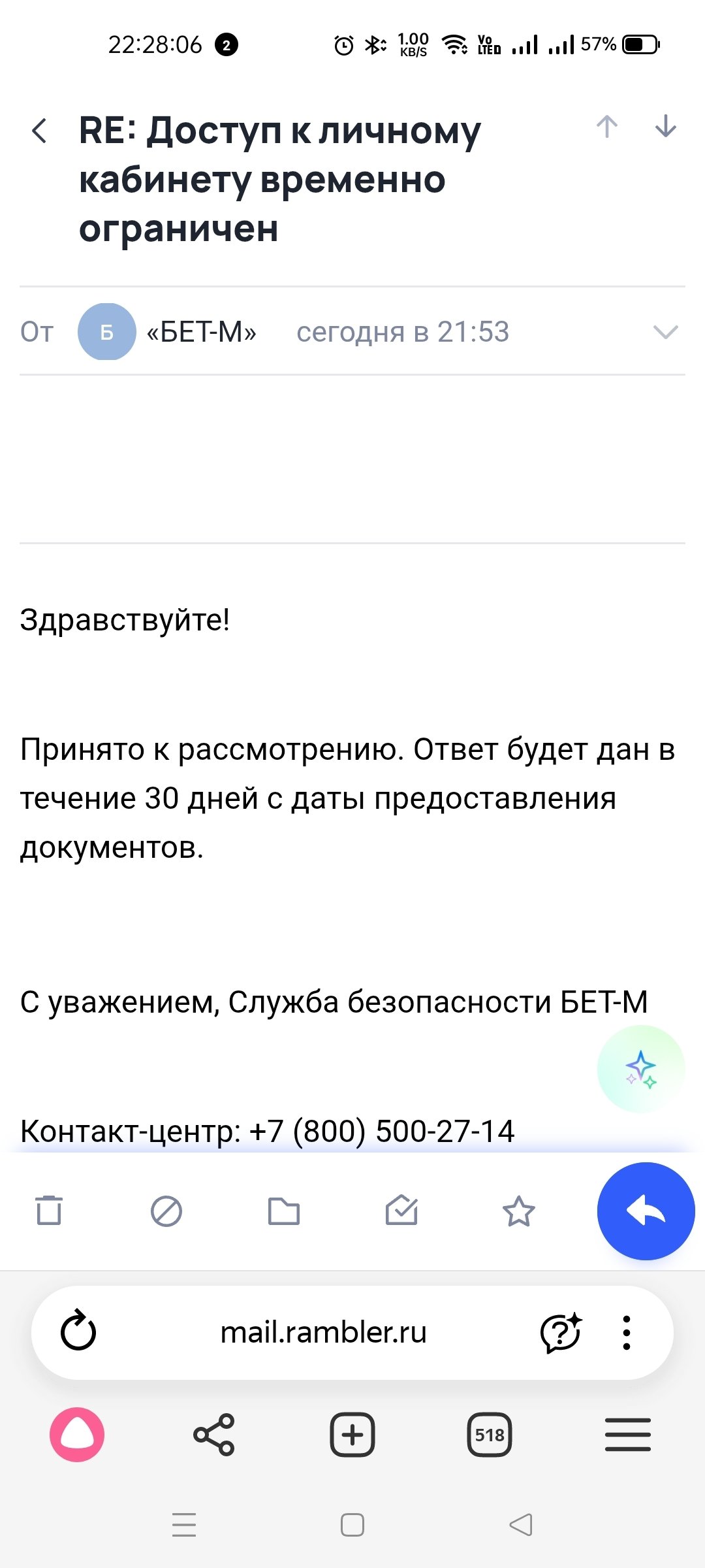 Сделал депозит на 5000₽, посмотреть линию и что за новая БК такая появилась,в итоге через час+- получил блок аккаунта, сколько играю в БК нигде даже в самых мелких и с плохой репутацией такого не встречал.Пиши в поддержку,они дают почту службы безопасности,мол мы ничем помочь не можем,в итоге пишу туда и пол дня письмо не уходит к ним,снова в поддержку и с 10 попытки всё таки отправили им запрос,в итоге пишут чтобы ПРОДОЛЖИТЬ пользоваться услугами нашей компании нужно прислать огромный список документов и фотографий,я естественно пользоваться услугами этих скамеров не планирую,а хочу забрать свой депозит и на этом попрощаться,в итоге никто двое суток на почту не отвечает,в поддержке по телефону сидит "ребёнок" который вообще ничего не может ответить и ничем помочь, только ссылается на службу безопасности,которая элементарно не отвечает)зачем они вышли на рынок не понятно,если даже депозиты они не могут отдать,хотя не трудно догадаться,в общем это скамеры,платить там никто ничего не собирается изначально,а депозиты вернуть думаю тоже будет сложнее чем пойти верификацию в любой обычной БК,так что делайте выводы)