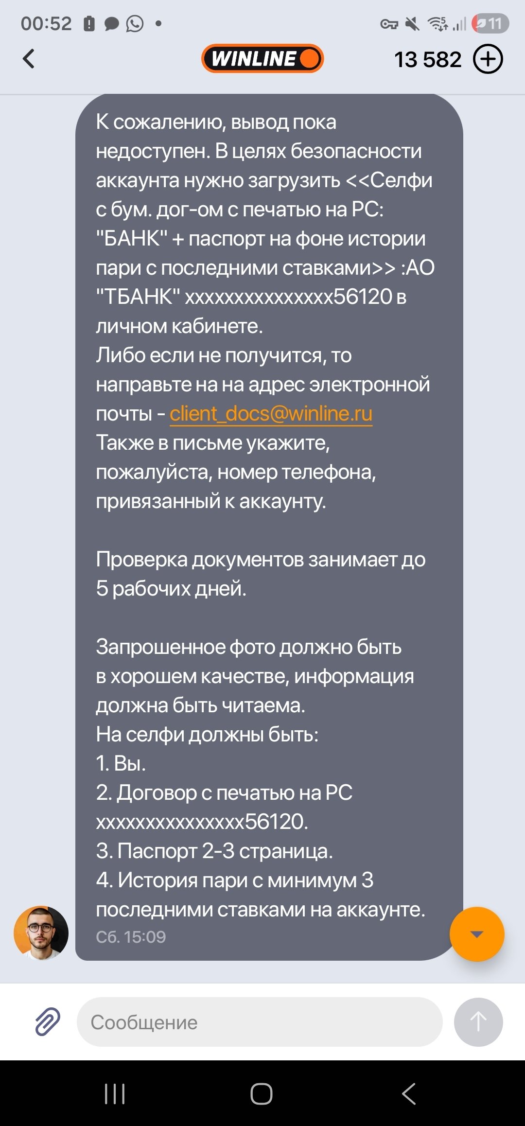 Каждый день запрашивают новые и новые документы, при том, что я уже проходила верификацию, после которой мне ещё и порезали максимальные суммы. Так вот, сначала попросили паспорт, потом справку об открытии счета в банке в электронном виде, потом с живой печатью, теперь просят шедевр: селфи! с договором об открытии РС с живой печатью, копией паспорта и скрином последних трех ставок. Всё на одном фото и читаемо. Я попросила образец, как это возможно физически. Молчат. Фотографируют, видимо...