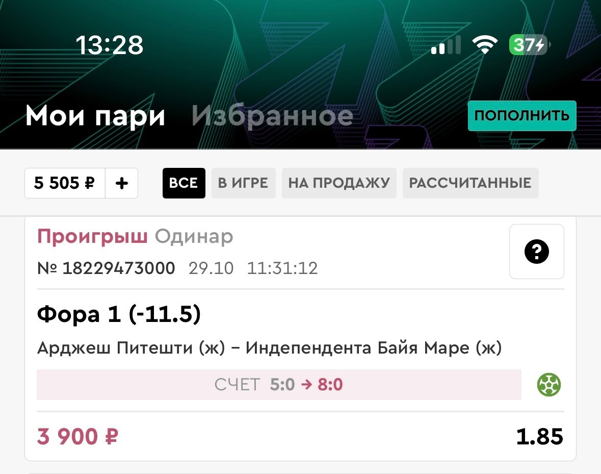 Сделал ставку тотал > на МатчАрджеш Питешти (ж) - Индепендента Байя Маре (ж), но матч был прерван со счетом 5-0. Бк PARI рассчитало ставку как проигрыш со счетом 8-0 присылая скрин с непонятного источника. На оф сайте клуба нет счета матча и я нигде не нашел официального подтверждения данным предоставляемыми бк PARI. Также другие БК по данному пари произвели возврат. Прошу помочь.
