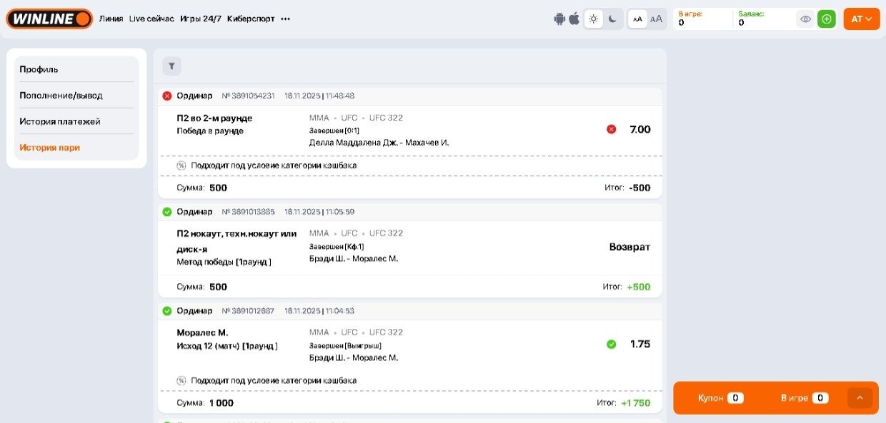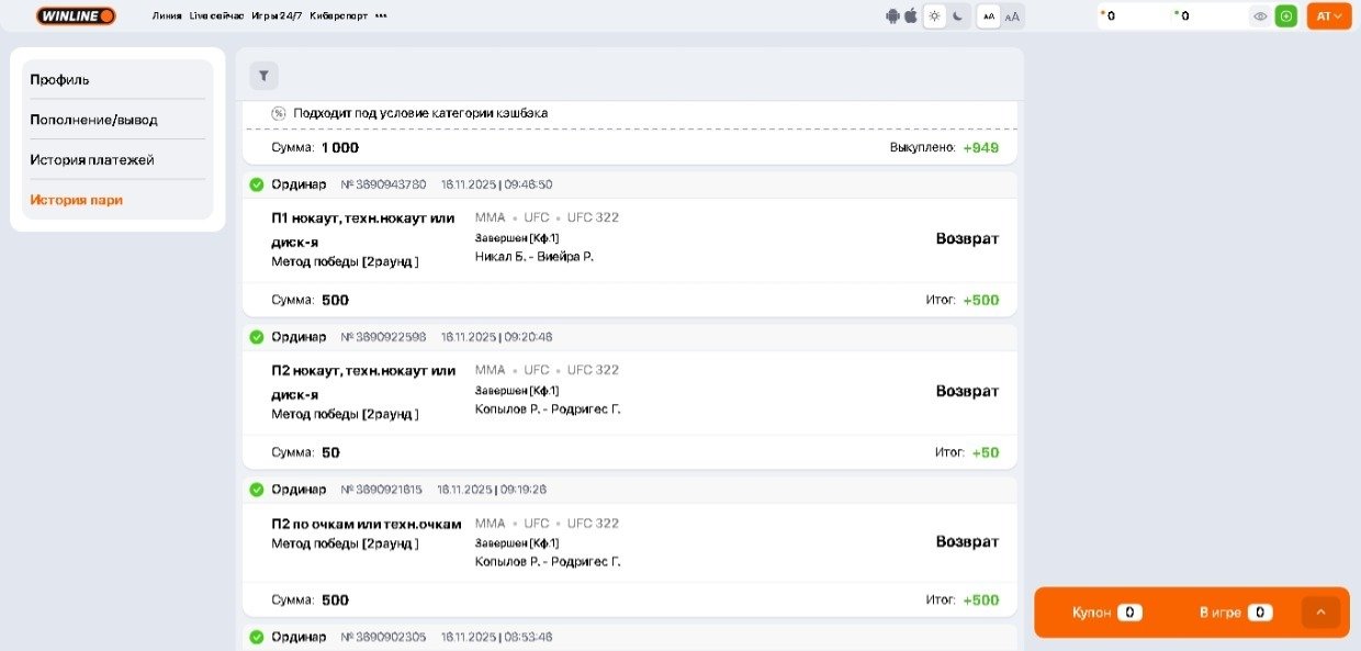 я поставил несколько ставок на UFC 322 на разные события в разное время. Все ставки изначально были рассчитаны верно, однако впоследствии последняя ставка оказалась «в игре» уже после окончания матча и расчета. Я позвонил в поддержку и оператор сказал, что еще отсутствует официальный результат. Примерно через 40 минут все ставки были рассчитаны с кф 1. В поддержке мне сказали что произошел разрыв соединения, что странно, потому время между ставками составляло +- 25 минут и именно все ставки оказались не рассчитанными