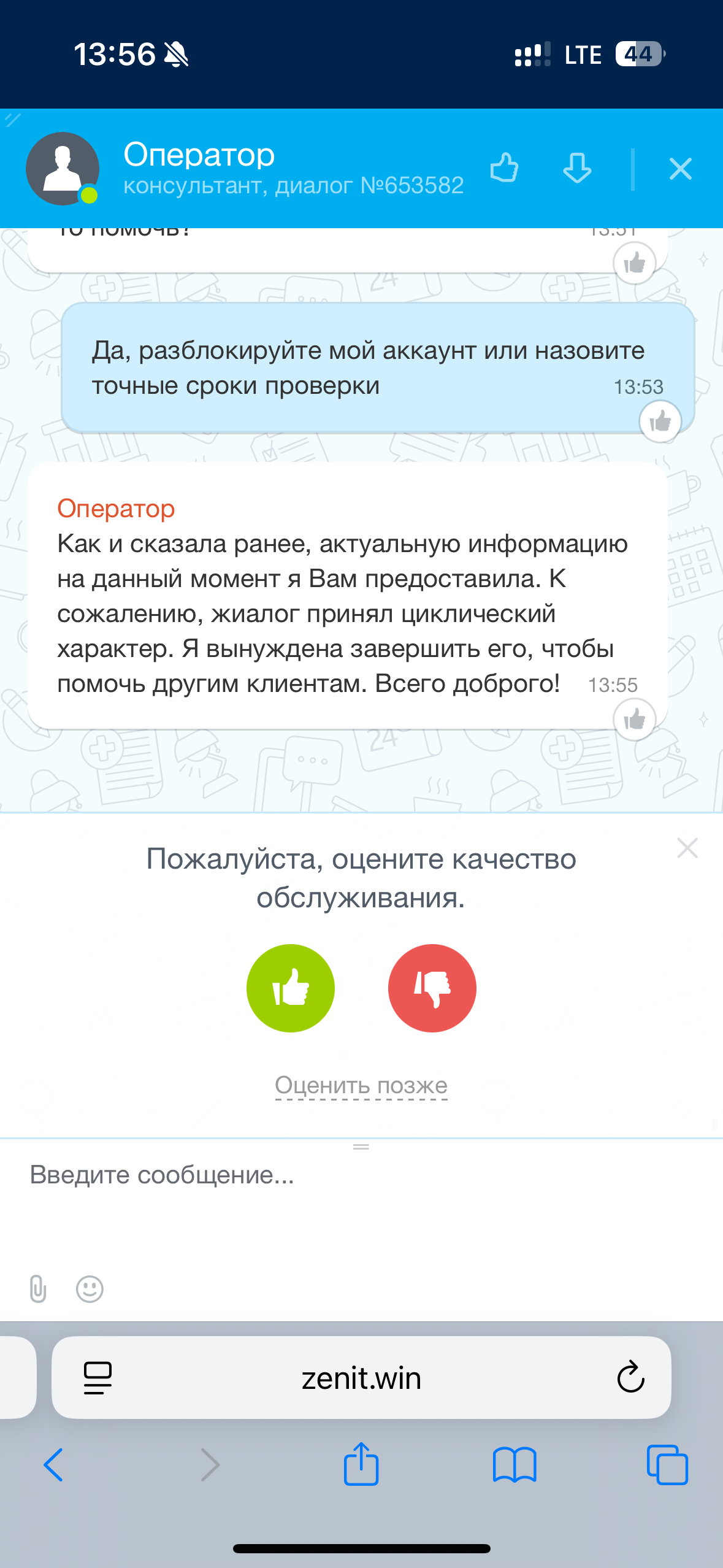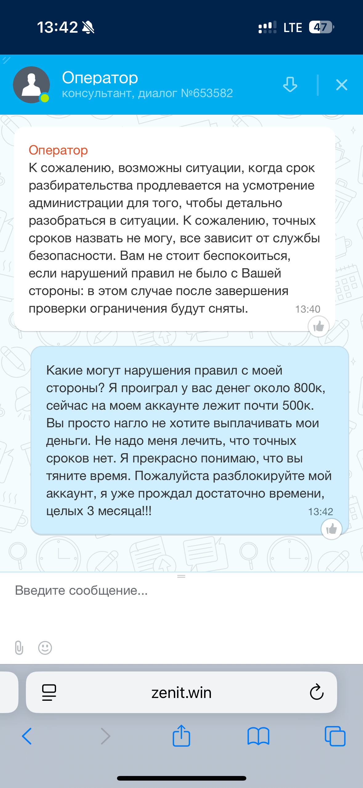 Здравствуйте! Бк Зенит заблокировала аккаунт на 3 месяца. Это врем истекло и я обратился к ним. Мне начинают писать какую-то ересь чтобы надо еще подождать, а конкретное время назвать намеренно не хотят! Проиграл я примерно 800к, сейчас на аккаунте лежит 451к и они даже не дают войти в счет. Пожалуйста помогите!
