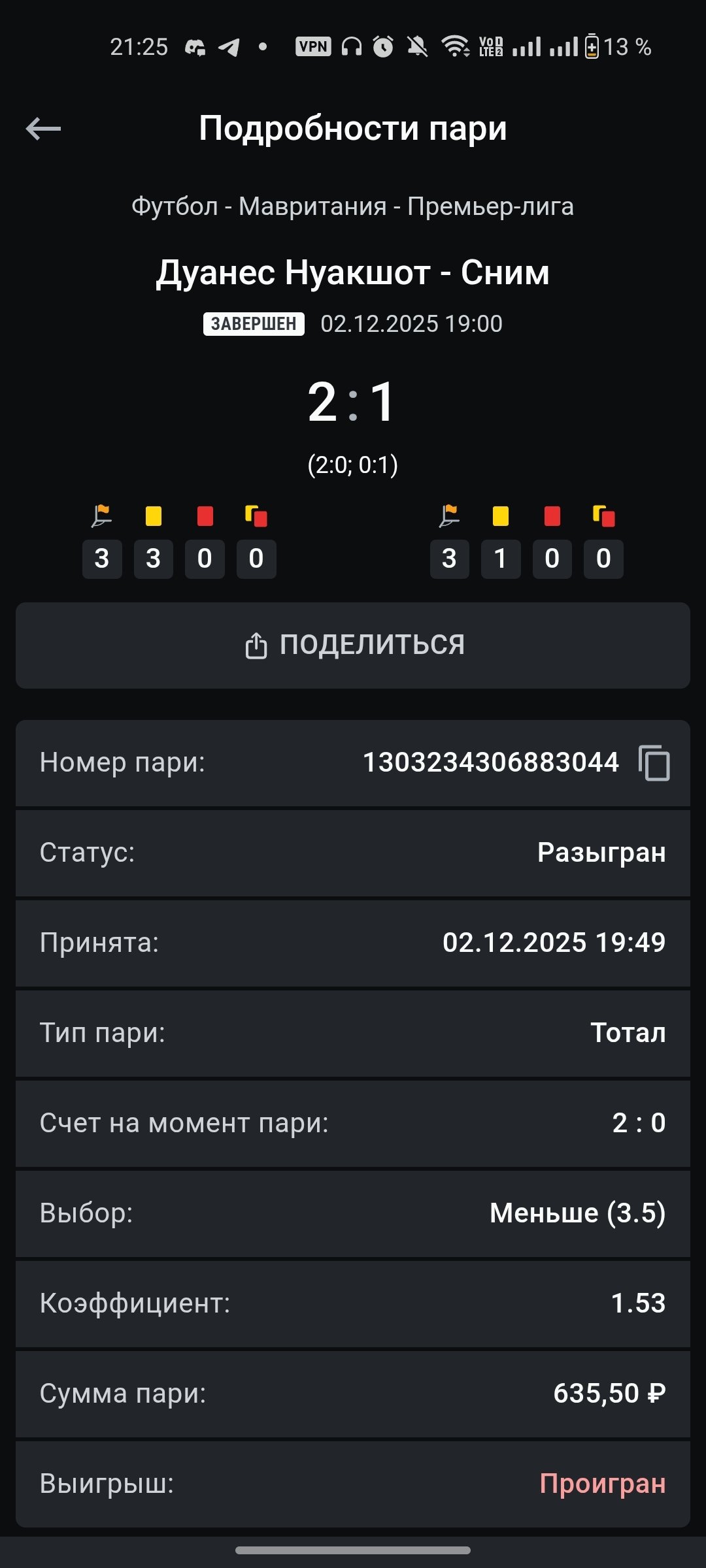 Добрый вечер произвел ставку в размере 635р на событие футбол Дуанес Нуакшот - Сним , ТМ 3.5 , итоговый счёт события 2:1, пари рассчитано как проигрышное, в чате поддержки никак не реагируют более 8 часов, прошу пересмотреть пари.