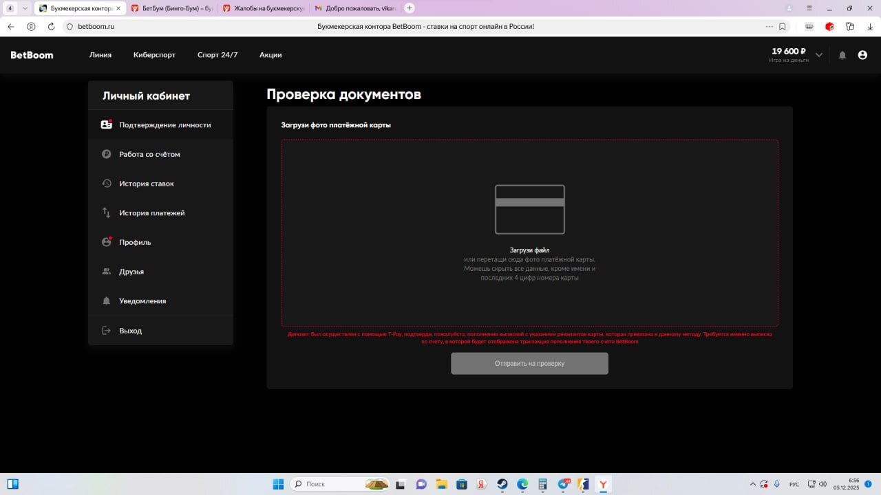 задепала свои 50000 рублей !. Я играю на дурака просто на удачу ставила на всё подряд . Потом поставила на футбол и выиграла 81000 рублей поставила на вывод .Пришла верификация отправила документы приняли всё и попросили дополнительно выписку по карте оплачивала с T-PAY выписку нельзя отправить PDF у них на сайте написала на почту молчат прошу помочь с выводом средств с данной бк. Сейчас вам предоставлю скриншоты