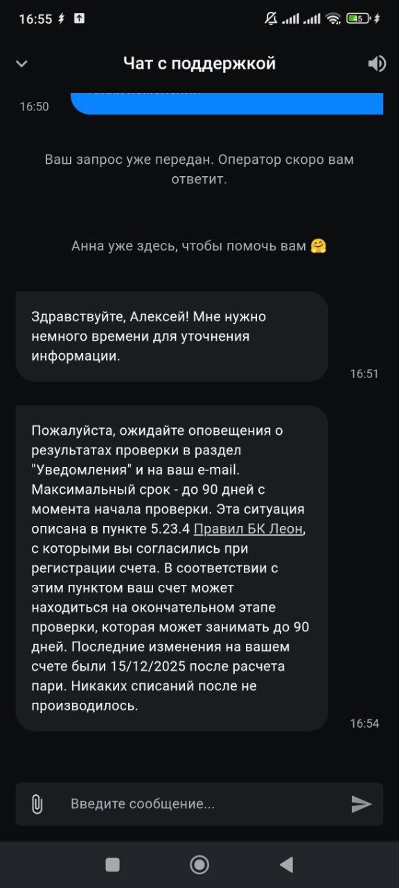 Здравствуйте. Зарегистрировался в БК Леон . Проблемы начались года с отключения акций. сильного понижения лимитов. и запросы документов. Что, соответствует правилам бк. И к чему вопросов нет. После предоставления последних требуемых документов. Стала возможность выбрать дату проведения видеоконференции, и заблокирована возможность делать ставки, хотя в момент когда я предоставлял документы. такая функция еще была возможна. была выбрана ближайшая , что к слову, крайне оперативно, исходя из опытов других участников с которым я ознакомился у вас на сайте. Мною она вчера была пройдена. И соответственно, основываясь на правилах бк. Ждать ответа надо в течении 90 дней. Проблема случилась сегодня. Когда зайдя в счет, я с удивлением отметил изменение баланса. Вчера еще баланс был 19534345,06 а сегодня стал 18652365,43. На вопрос в службу поддержки о причинах данных изменений. Мне было отвечено что счет на проверке до 90 дней.. а последние изменения на моем счете были после расчета пари. Что действительности не соответствует. Как можно понять.. история ставок и история вводов выводов средств отсутствует. Да и изменения баланса, спустя три дня после последней рассчитанной ставки вызывает вопросы. Прошу администрацию сайте Легалбет посодействовать в данном вопросе.