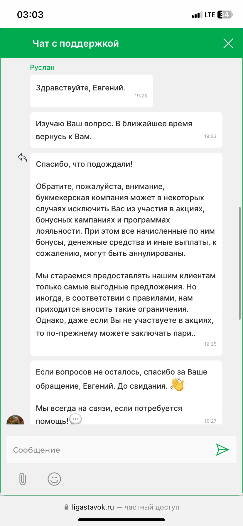 По информации от букмекера, игроку отказано в участии в бонусной программе по решению БК. При этом фактов нарушения каких-либо правил не предоставлено. Арбитраж Легалбет не допускает возможности исключать из бонусных акций игроков, не нарушающих правила, только "по усмотрению букмекера". Статус - не решено.