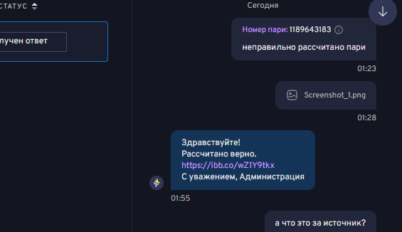 Неправильно рассчитана ставка на матч Пиза Ювентус -оф источник пишет 0-7 их источник пишет 0-7 -они пишут 0-6.как обычно ссылаются на свои сомнительные скриншоты и правила -которые толком не содержат точной информации и точных правил.так вот в соответствии с ихними правилами отмены никакой не было и первоначальная статистика понятие очень условное(где у них в правилас описан точный тайминг) .суть в том что поначалу первый гол ювентуса записали как автогол -потом исправили и поменялась статистика-вместо того чтобы разобраться не хотят разговаривать отвечают долго и отключают чат.Если они опять "засрутся" и не рассчитают по честному -точно больше играть у них не будем-"если они такие правильные -то и мы будем такими же"-так и передайте им если можно.
