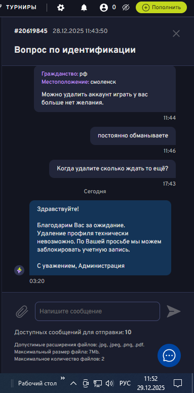 После того как в очередной раз они "прокатили" со статистикой -решил больше не играть в этой бк и попросил удалить аккаунт на что получил ответ можем "заблокировать"-заблокировать я и сам могу -мне бы удалить.Дело принципа-раз контора принципиальная -значит и игроки у неё должны быть такие же.