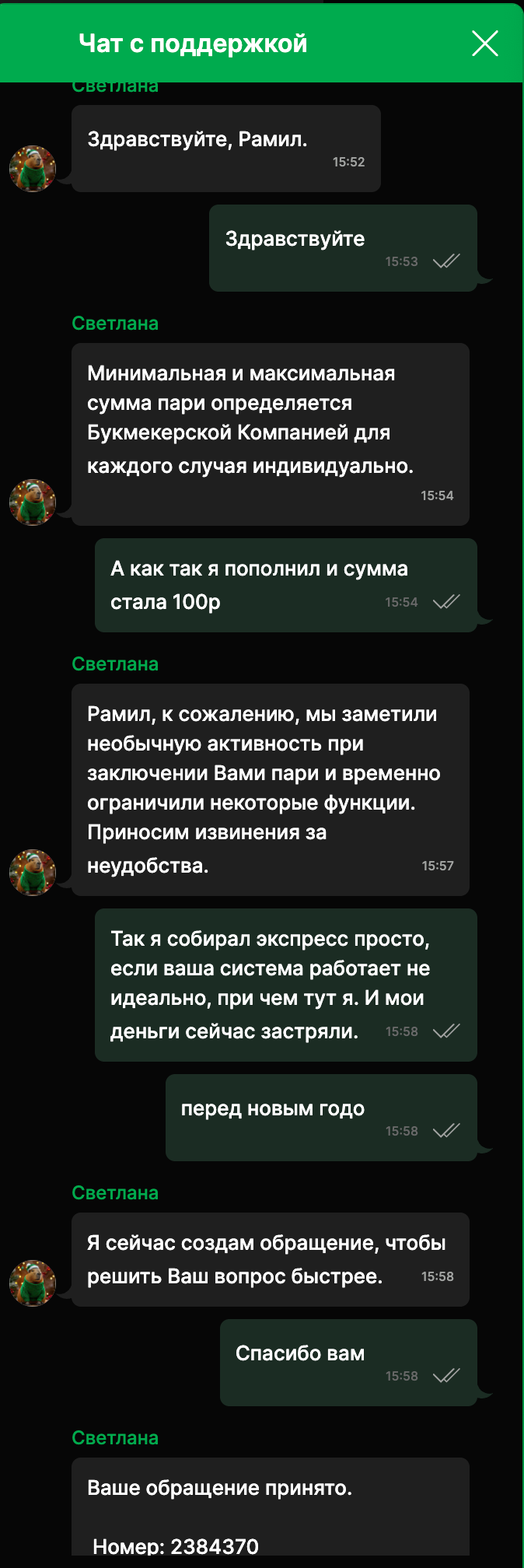 Пополнил счет на р. Сразу после этого БК порезала лимиты на ставки до 100 рублей. Суть нарушения: Навязывание невыполнимых условий. При лимите 100р для вывода средств с меня требуют "отыгрыш" депозита (100+ ставок), создавая риск потери средств. Введение в заблуждение. Оператор сначала написала, что для вывода нужна "хотя бы одна ставка" (я ее сделал). После этого условие внезапно изменилось на "полный отыгрыш депозита". Искусственное удержание средств. Мне сообщили, что пересмотр ограничений возможен "через месяц", фактически заморозив мои деньги на 30 дней. Отказ в расторжении договора. Я официально заявил в чате требование о расторжении договора и возврате средств. Оператор (Светлана) проигнорировала это юридически значимое требование и просто вышла из чата, заблокировав возможность ответа. Далее я написал в поддержку еще раз, но мне вообще никто не отвечает, даже нет сообщения поиска оператора. Прошу помочь вернуть средства, так как БК препятствует этому, меняя условия на ходу и игнорируя законное требование о расторжении договора. Скриншоты прилагаю.