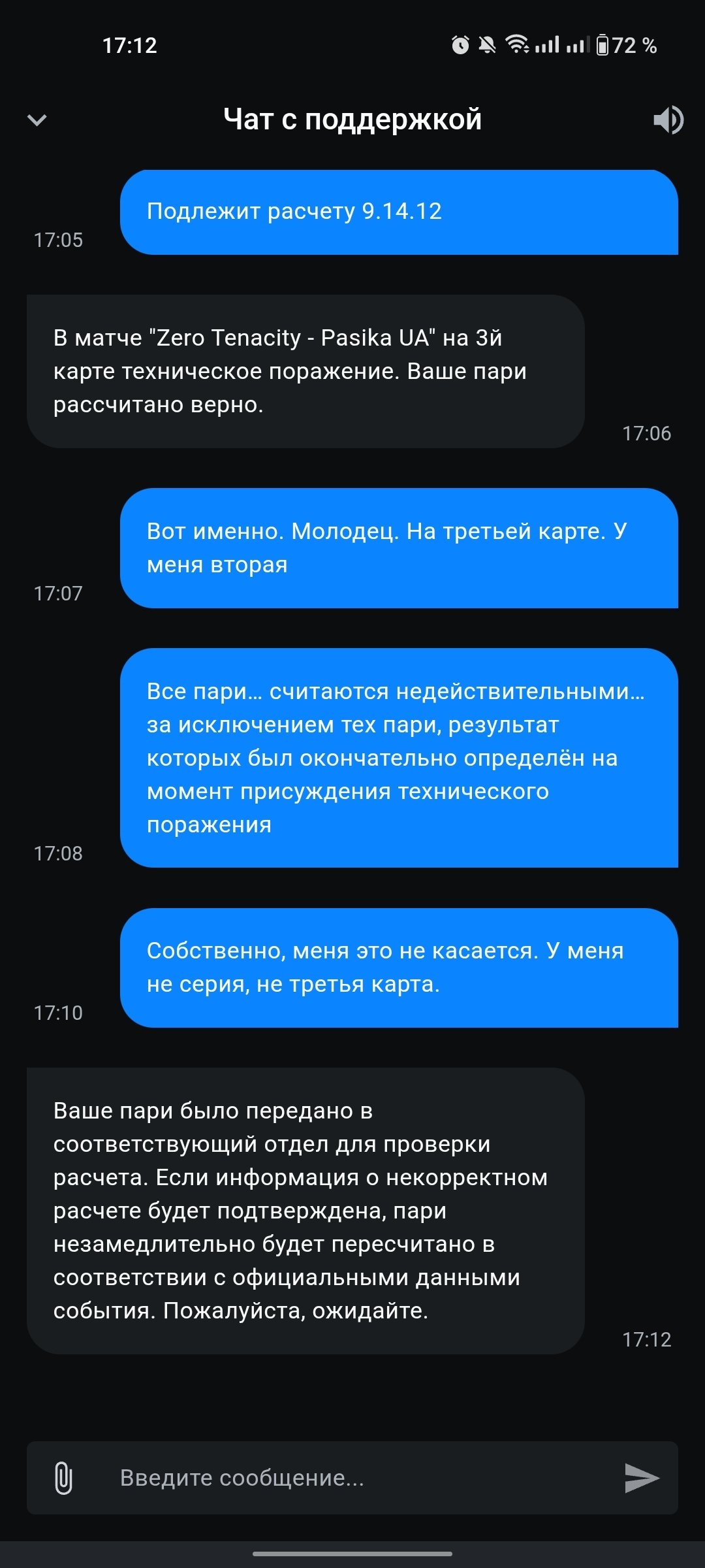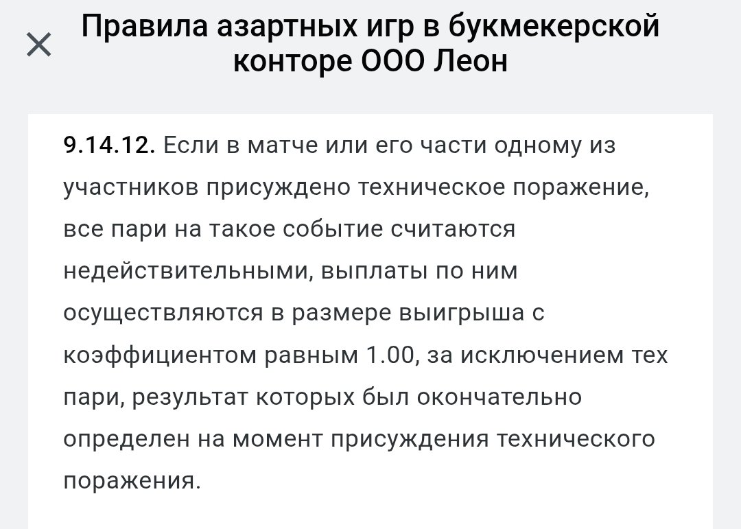 БК Леон неправомерно применила возврат (коэф. ) к выигранной части экспресса на вторую карту, ссылаясь на «техническое поражение», хотя карта была полностью доиграна и завершена победой Zero Tenacity. Это привело к потере прибыли. Поддержка игнорирует исключения в своих правилах, подменяет понятия, предоставляет ложную информацию и уклоняется от неудобных вопросов, демонстрируя некомпетентность и недобросовестность.Номер пари: 1315717891027614 экспресс 2-я карта Nemiga Gaming vs L1ga, победитель L1ga (коэф. ) — выиграная карта zero vs Pasika, победитель zero 1,93 - возврат по выдуманным причинам. Итоговый кеф 3,18. (Все имеющейся скрины и доказательства со стороны бк Леон предоставлю) БК изначально рассчитала как выигранный, но потом вернула часть на вторую карту с коэф. , мотивируя «техническим поражением матча». Это ложь: техническое поражение присуждено только за третью карту (отказ Pasika UA играть третью карту. Вторая карта доиграна полностью.Фактический исход матча (Точнее карты, подтверждён официальными источниками):Доказательства видео и источники:(1) Тайминг 3:12:42 — конец второй карты: Zero Tenacity проводит последнюю драку карта завершается нормальной победой Z10. Нет никаких признаков технических проблемили поражения на этой карте.1) 3:12:42 2) ) ) Все источники подтверждают: вторая карта завершена нормально, техническое поражение — только на третьей. БК Леон предоставляет ложную информацию, подменяя «тех. поражение серии» на «тех. поражение карты», чтобы избежать выплаты.(Любому играющему в данном бк рекомендую подумать прежде чем связываться с данной конторой. Вы стабильно будите обмануты.(По приколу добавлю видео с их любимой приколюхой.(Не дали добатить) Когда ставка на тотал, фору меняется на рандомную карту с таким же рандомным исходом. Взял тотал, держи победу на другой карте. )Нарушение правил Леон (игнор исключений и выборочность):Правила — публичная оферта, обязательная для них. Они игнорируют свои же тексты:П. (тех. поражение): «Все пари… считаются недействительными… за исключением тех пари, результат которых был окончательно определён на момент присуждения технического поражения.» — Результат map 2 определён до тех. поражения (map 3). Исключение применимо, но Леон игнорирует.П. (изменение количества карт): «Пари на победу карт… остаются в силе.» — Количество карт изменилось (Bo3 → Bo2 из-за отказа), но моя ставка на победу map 2 должна остаться. Игнор.П. (Dota 2, сдача/отказ): «При сдаче… пари на победителя карты остаются в силе… за исключением тех пари, исходы которых могут быть рассчитаны на основании информации на момент остановки.» — Map 2 не сдана, рассчитана по информации (трансляция). Игнор.П. 5.2/ (завершённые исходы): Исключения для «фактически завершённых» частей. Map 2 завершена — расчёт нормальный. Почему первую карту (проиграна) рассчитали, а вторую — нет? Выборочность.П. (пересчёт): «Право, но не обязанность» пересчитать. Они использовали для возврата, но игнорируя приоритет специальных правил ( > по п. 1.3). Подмена: результат map 2 не изменился.Это не ошибка, а системный обман: БК не может определиться с правилами (то «матч завершён тех. поражением», то «карта не определена»), подменяет «серию» на «карту», чтобы избежать выплат. В переписке — шаблоны без обоснования. Аргументы с доказательствами видео просто улетают в игнор. Отвечать где и что, в указанном тайминге считает