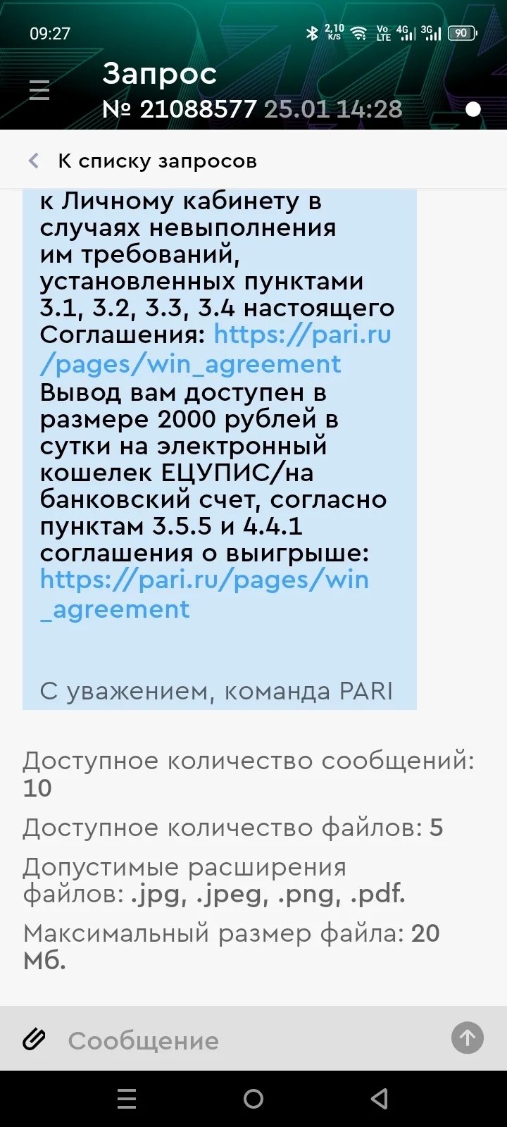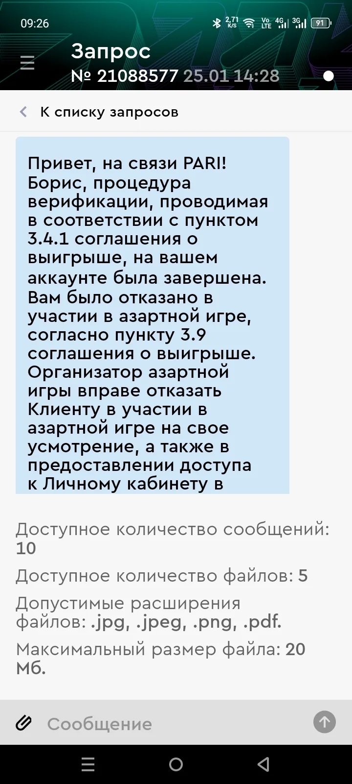 Здравствуйте, прошу разобраться на каком основании Пари ограничил вывод средств и блокировку игрового аккаунта. Я честно играл не нарушая правил, мною было введено порядка 30 тысяч, выигрыш составил 187 тысяч. И при попытке вывода затребовали верефикацию,всё требуемое от меня отправил,ждал 7 дней и как итог,букмейкер ограничел вывод средств по 2 тысячи в сутки. Без объяснения каких либо причин. Изучив пункты соглашения,на которое ссылаются букмейкер не обноружил не каких причин для таких действий. Мною было всё предоставлено согласно запросу. Ограничением вывода средств букмейкер нарушает мои права, пусть блокируют игру, вопросов нет, но выплатят мой выигрыш в полном объёме. Прочитав отховы,могу сделать вывод что данная контора такие махинации проводит регулярно. Пору разобраться в данной ситуации и выплатить выигрыш в полном объёме,более мне уже не чего не нужно от данного букмейкера. iD 75988944