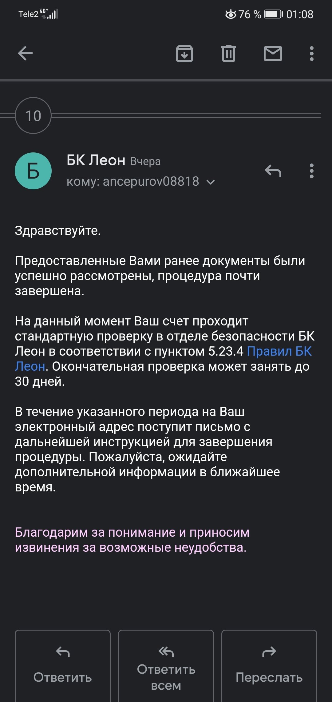 Верификация успешно завершена, вывод средств доступен. Проблема решена без участия Арбитража Легалбет.