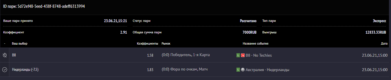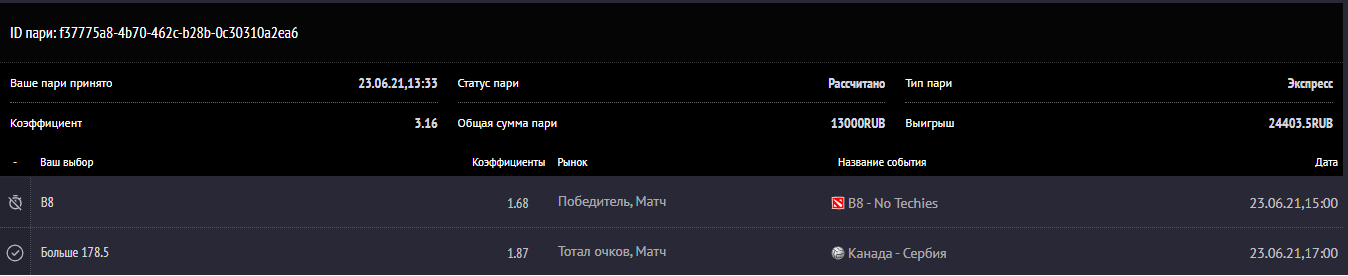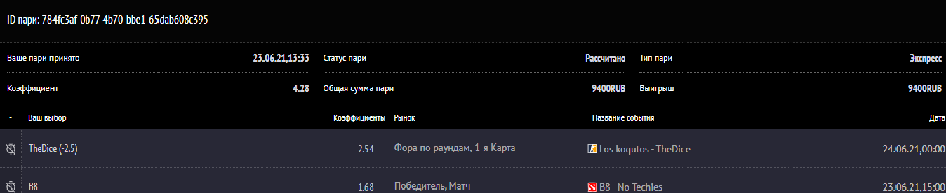 Контора обвинила в том,что заранее знал результат матча в диcциплине Dota2, квалификация к турниру The International 10 Восточная Европа матч между командами B8 и No Techies. Я ставил три пари на эти события, из них два в прематче примерно за 1.5 часа до начала матча и один в лайве на первую карту. Все события были в экспрессах!!! И вы по всем дали возврат, хотя на это нет ни одного основания. То есть получается я знал исход матча заранее и поставил все события в экспрессы с событиями, которые никак не пересекаются. В описании указана общую сумма на все три экспресса. Чтобы вы понимали, ставлю я обычно гораздо больше.